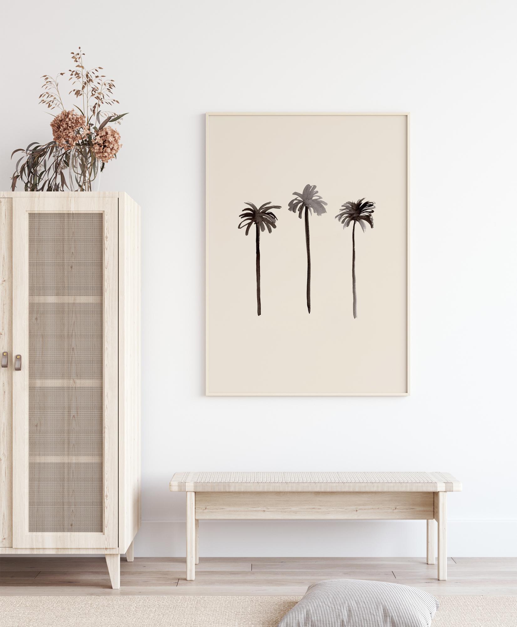 Ein einfacher schwarz-weißer Handabdruck von drei Palmen in einer Reihe. Auf einem beigen Hintergrund wurden verschiedene Schwarztöne verwendet, um die Dunkelheit der Blätter hervorzuheben. Ein einfacher Druck zum Aufhängen an Ihrer Wohnzimmerwand.