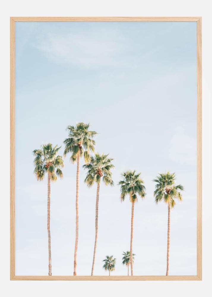 Ein reizvoller Druck von fünf Palmen in einer Reihe. Der blassblaue Himmel harmoniert perfekt mit den sanften Grün- und Brauntönen der Palmen. Zwei weitere Palmen sind in der Ferne zu sehen. Ein schöner Druck, der an einer hellblauen Wand hängen sollte.