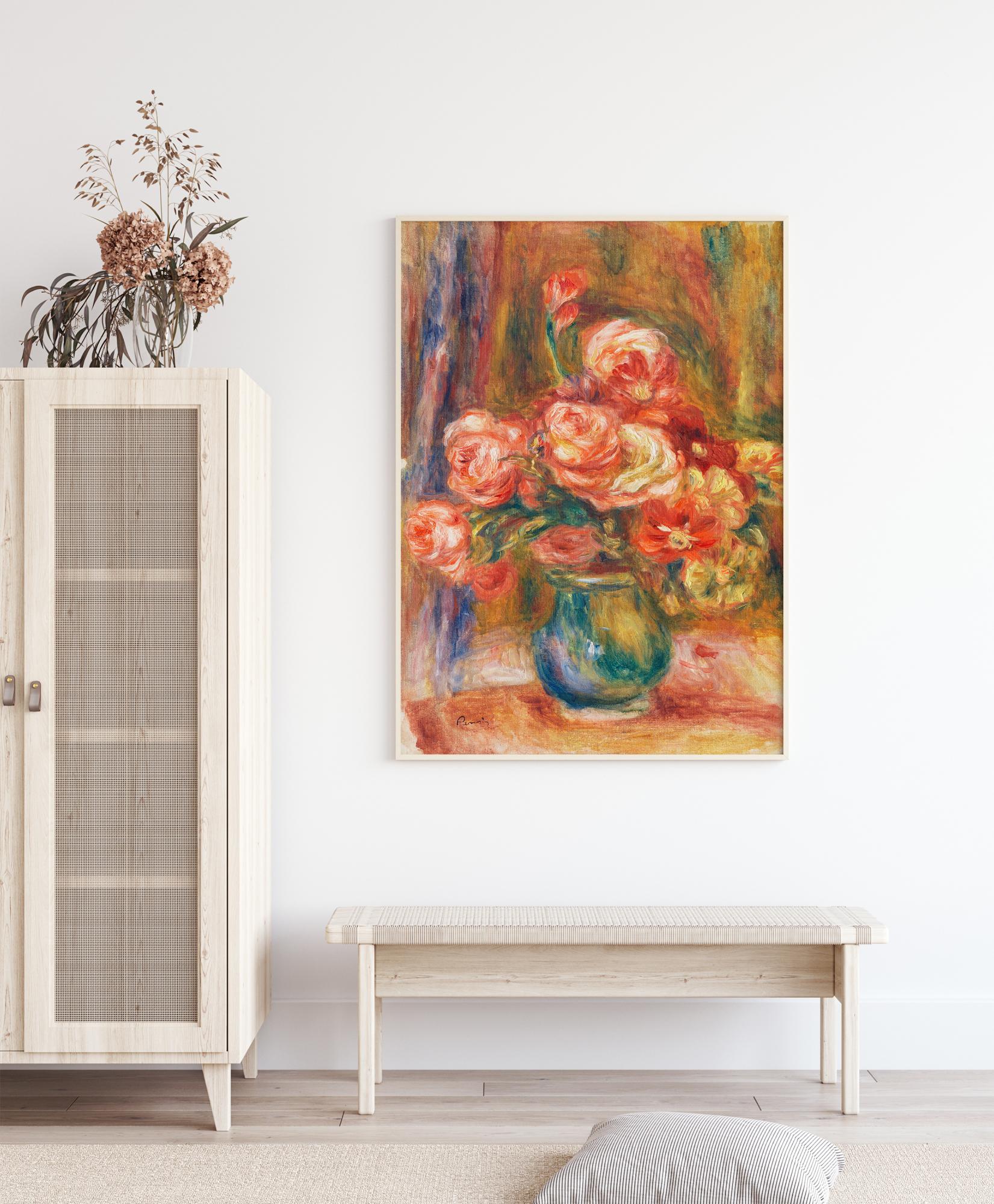 Ein wunderschönes handgemaltes Rosenbouquet. Dieser atemberaubende Druck aus orangefarbenen und roten Rosen in einer grünen und farbigen Vase vermittelt ein warmes, beruhigendes Gefühl. Die Kombination von Farben auf einem mehrfarbigen Hintergrund harmoniert perfekt miteinander. Bringen Sie Ihr Zuhause mit diesem reizvollen Druck zum Strahlen.