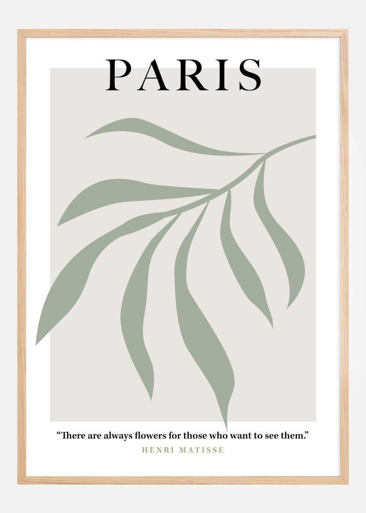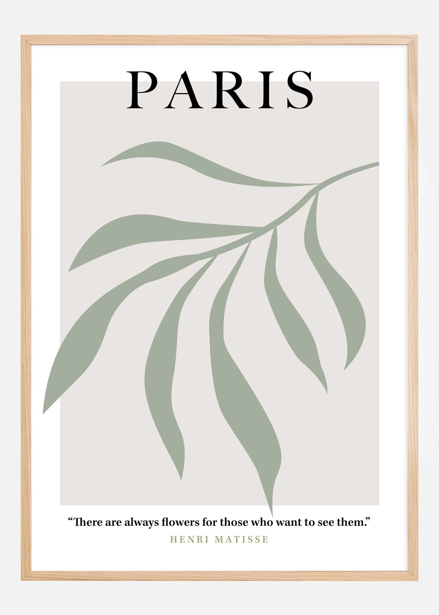 Dieses stilvolle und elegante Poster trägt das Wort "PARIS" in großen Buchstaben, vor einem Hintergrund aus sanft grünen Linien, die eine abstrakte, organische Form bilden, die an ruhige und kühle Gärten erinnert. Seine gedämpfte Farbpalette vermittelt ein Gefühl von Frieden und subtiler Eleganz, was dem Ruf der Stadt als Zentrum für Schönheit und Kultur entspricht. Es wird durch ein inspirierendes Zitat von Henri Matisse ergänzt, das dem Poster eine Tiefe künstlerischer Weisheit verleiht: "There are always flowers for those who want to see them."