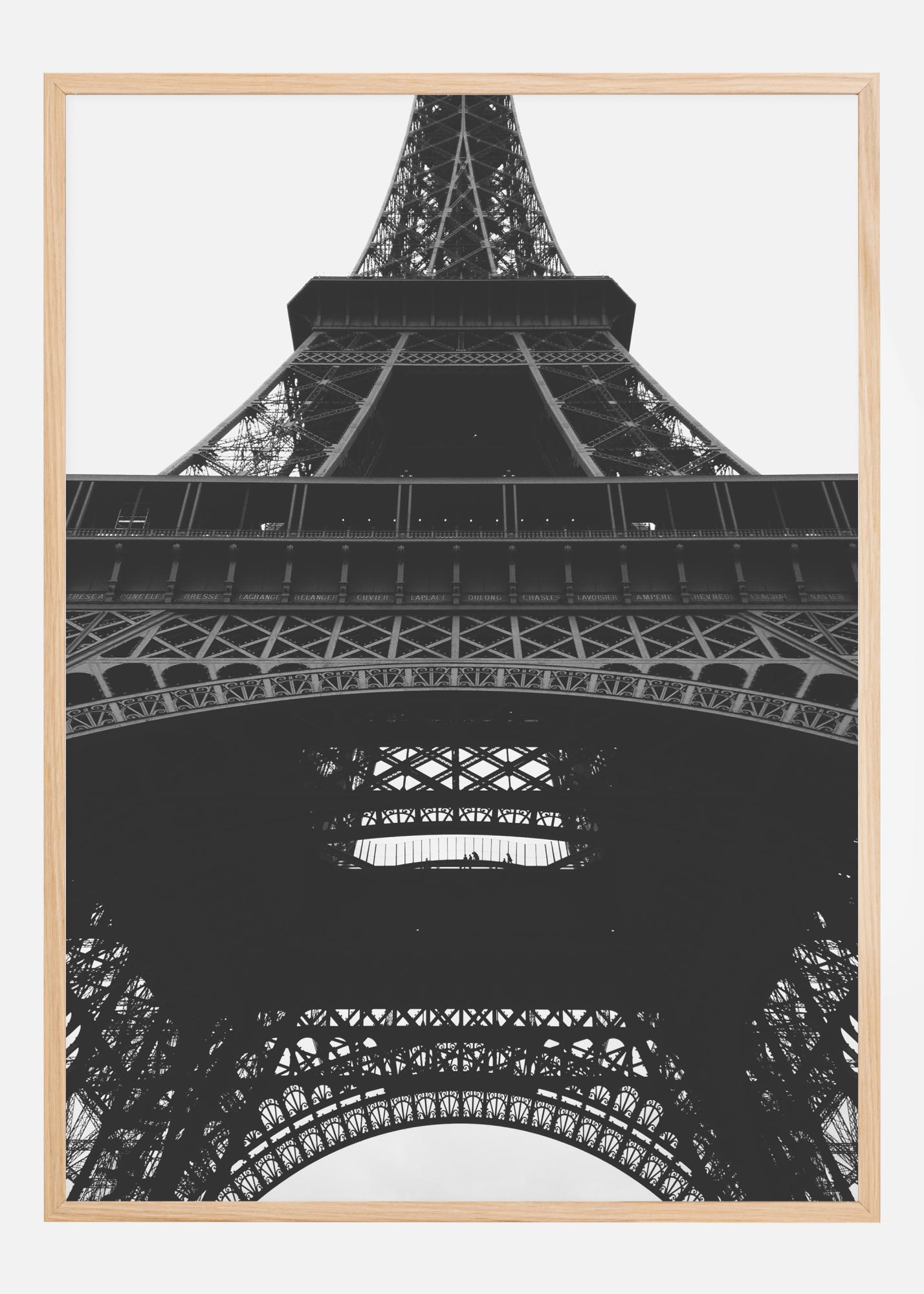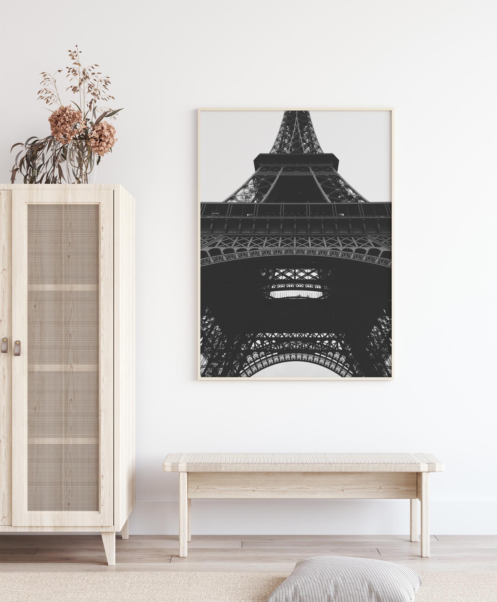 Ein atemberaubendes Schwarz-Weiß-Poster des Eiffelturms. Aus der Perspektive von unten nach oben aufgenommen, fügt sich die solide Eisenpfützenstruktur perfekt in den grauen Himmel ein. Dieses technische Meisterwerk schafft eine leichte, luftige und doch starke Struktur. Ein perfekter Druck zum Aufhängen in einer modernen Umgebung.