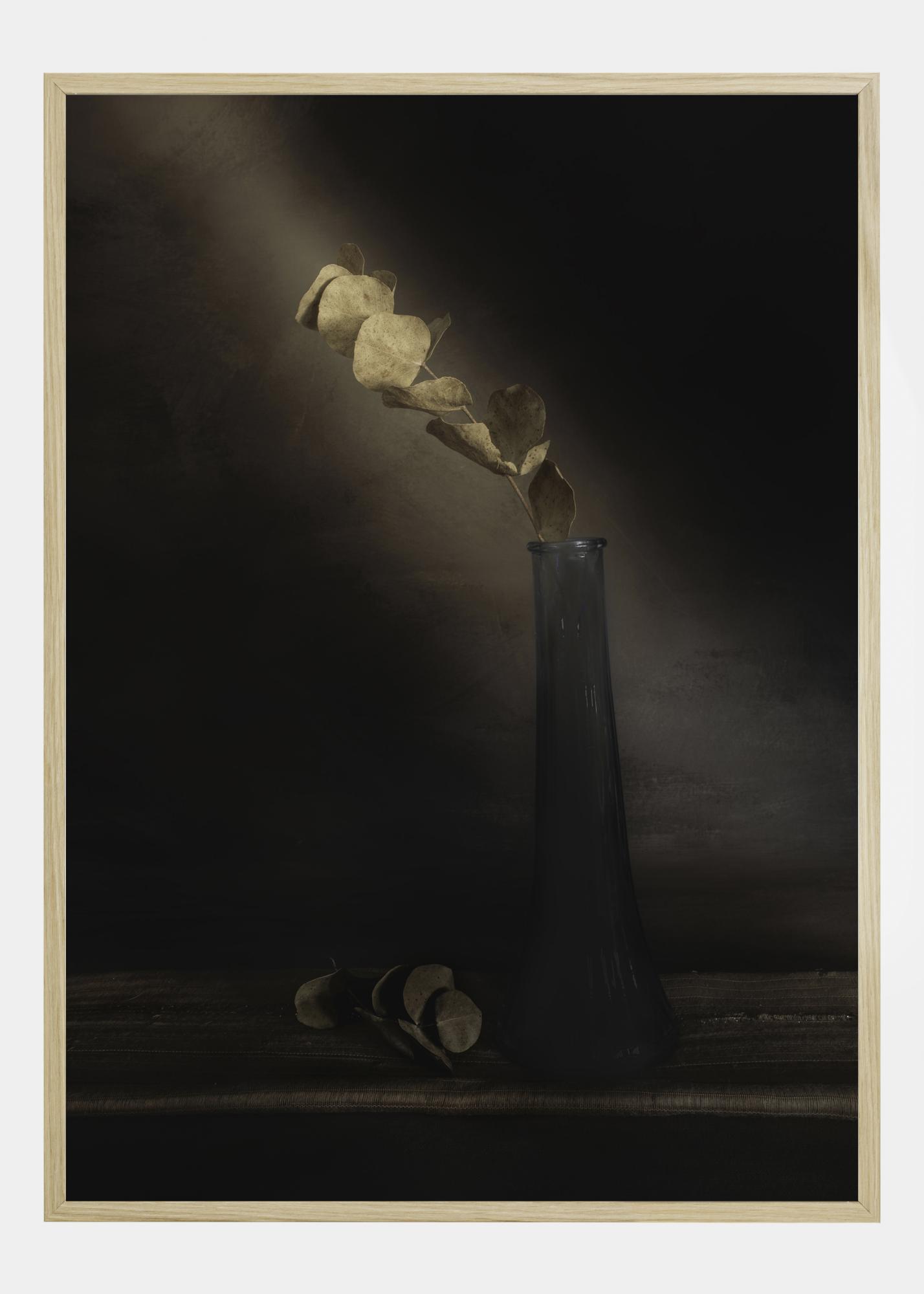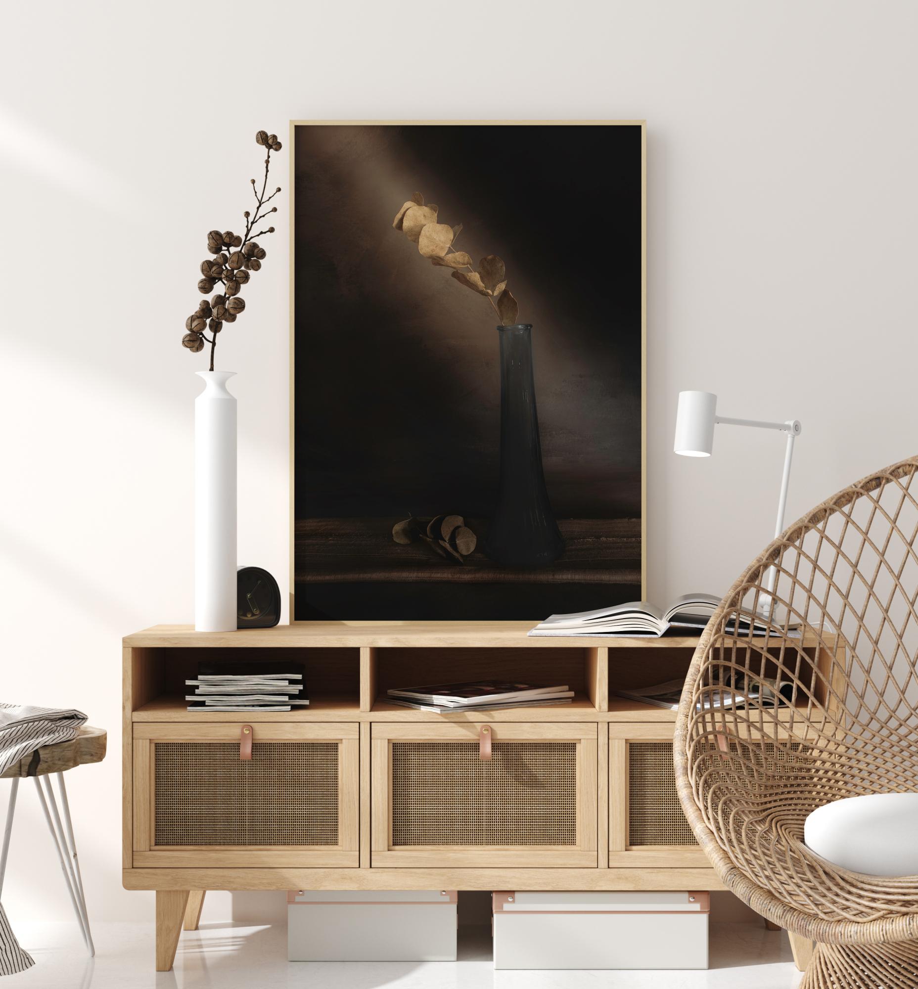 Ein einfacher, aber schöner Druck eines einzelnen Stängels mit getrockneten Blättern in einer Glasvase. Auf einem hellbraunen Hintergrund scheint das natürliche Licht direkt auf das getrocknete Gras. Am unteren Rand des Bildes liegt eine Sammlung von Blättern, die vom Stängel gefallen sind. Ein reizvoller Druck, der in einer friedlichen Umgebung hängen sollte.