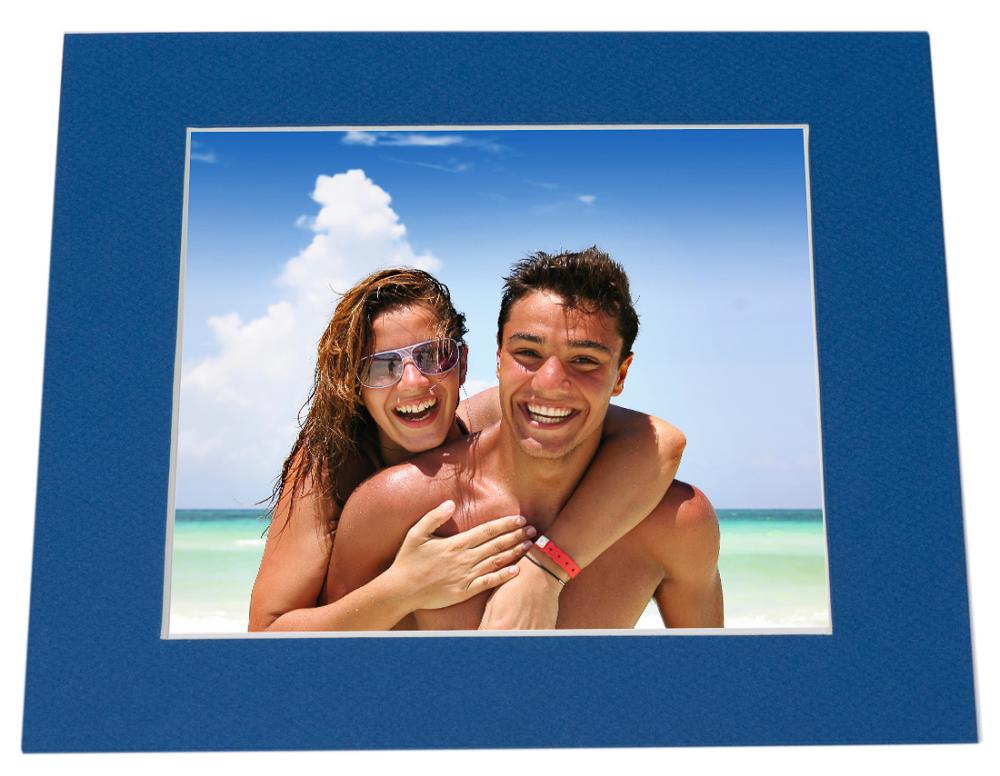 Blaues Passepartout von hoher Qualität vom Marktführer: Canson. Cansons Passepartouts sind selbstverständlich säurefrei und pH neutral, was für eine lange Haltbarkeit wichtig ist. Die schräg geschnittenen, inneren Kanten sind weiß.
