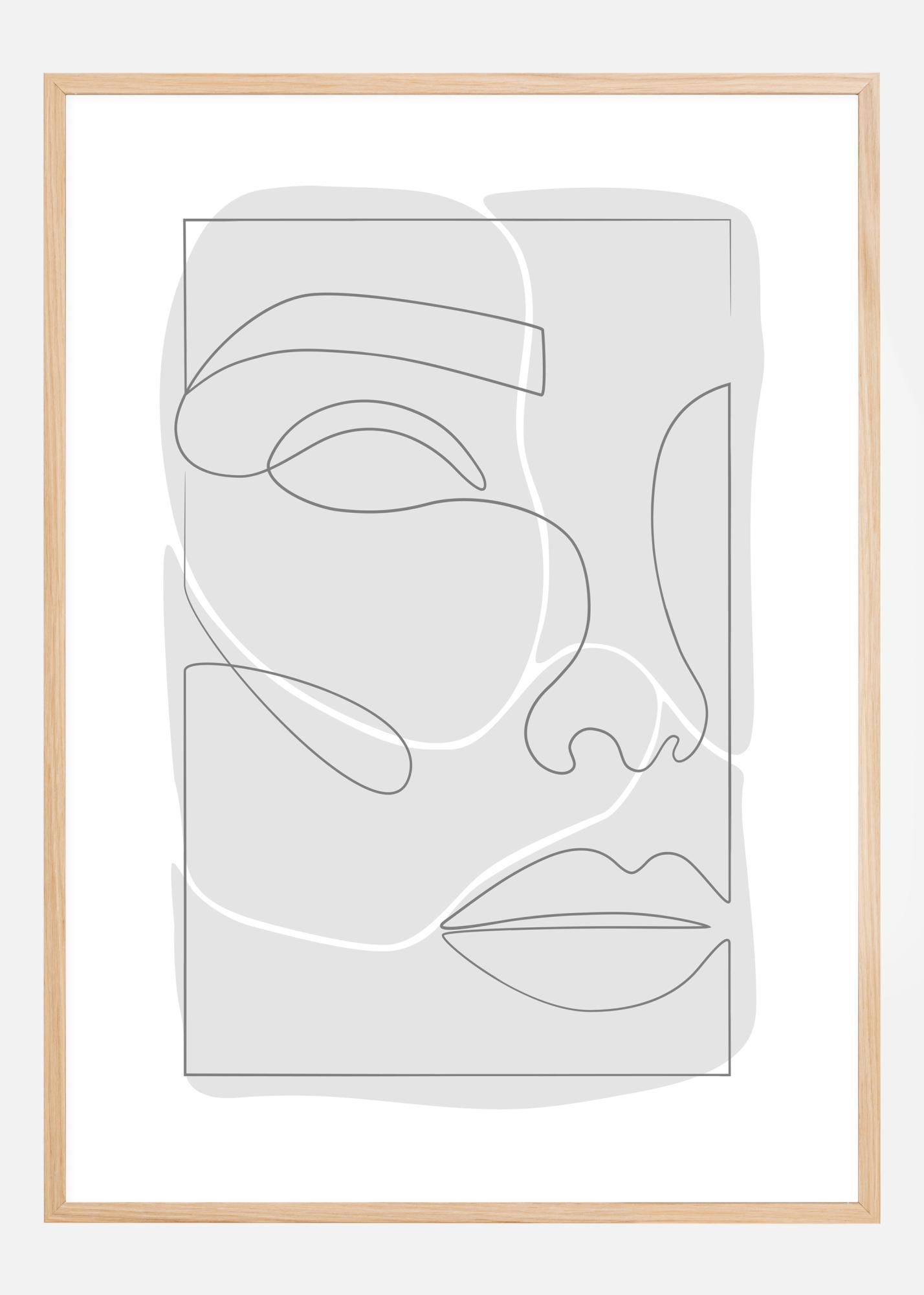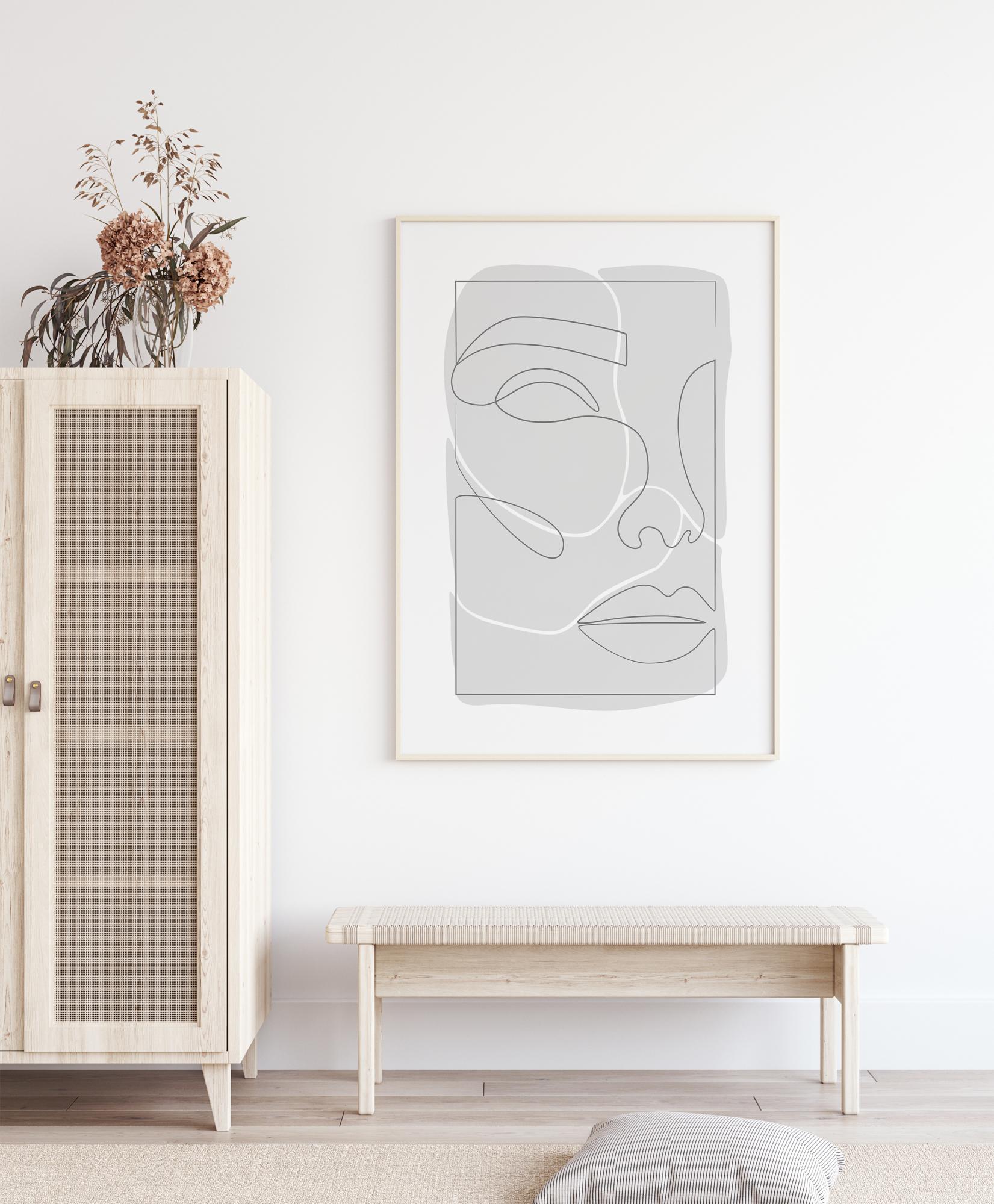 Ein wunderschönes Poster mit einem weiblichen Gesicht. Auf einem grauen Hintergrund sind mit einer einzigen schwarzen Linie die Nase, die Lippen, das Auge und die Augenbrauen der Frau gezeichnet. Um diesem schönen Druck einen Hauch von Weiß hinzuzufügen, wurden das Auge und die Wange der Frau hervorgehoben. Ein schöner Druck für jede Frau.