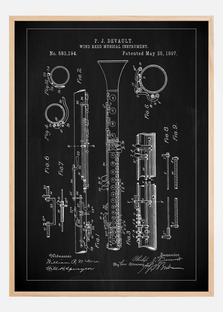 Betrachten Sie dieses prächtige Patentplakat, eine Hommage an musikalische Innovation und Design. Dieses Poster stellt P.J. DeVaults Klarinette dar, ein Patent, das am 25. Mai 1897 unter der Nummer 583.194 erteilt wurde. Diese genaue Reproduktion der ursprünglichen Patentskizze zeigt die komplexe Mechanik und Schönheit des Instruments, ein perfekter Akzent für jeden Raum, in dem Musik und Geschichte geschätzt werden.