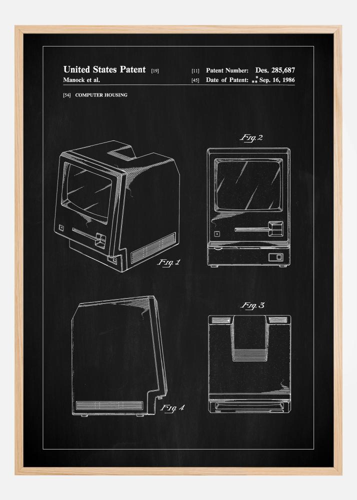 Dieses Patentposter zeigt ein Computerkabinett-Design für Macintosh oder Mac, repräsentiert durch das US Design Patent Des. 285,687, ausgestellt am 16. September 1986. Die Zeichnung hebt den klassischen Stil der Computergehäuse aus der Mitte der 1980er Jahre hervor, eine Ära, in der Personal Computer in Wohnhäusern und Büros alltäglich wurden. Seine unverwechselbare Form und sein Stil spiegeln die technischen und ästhetischen Ideale jener Zeit wider.