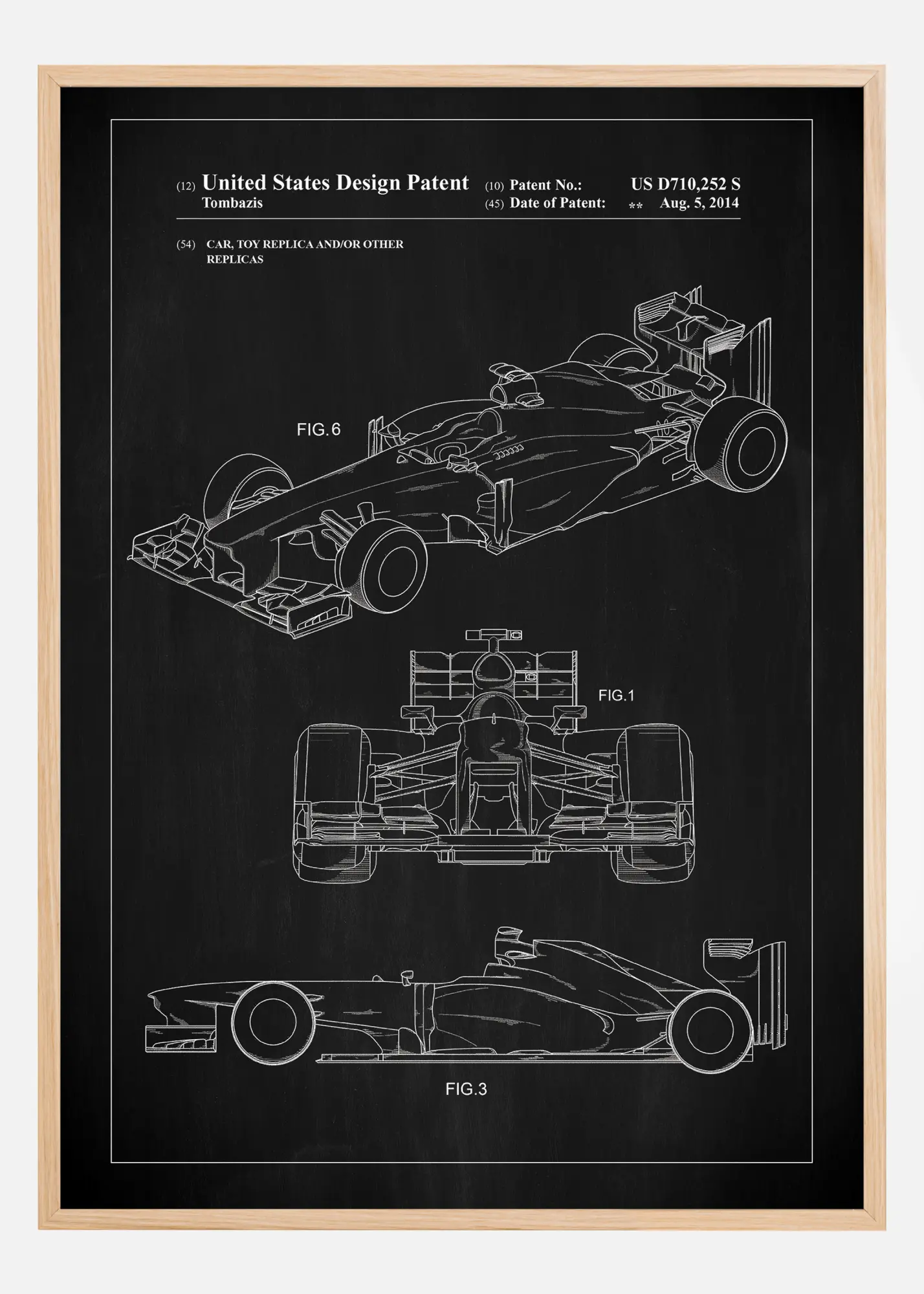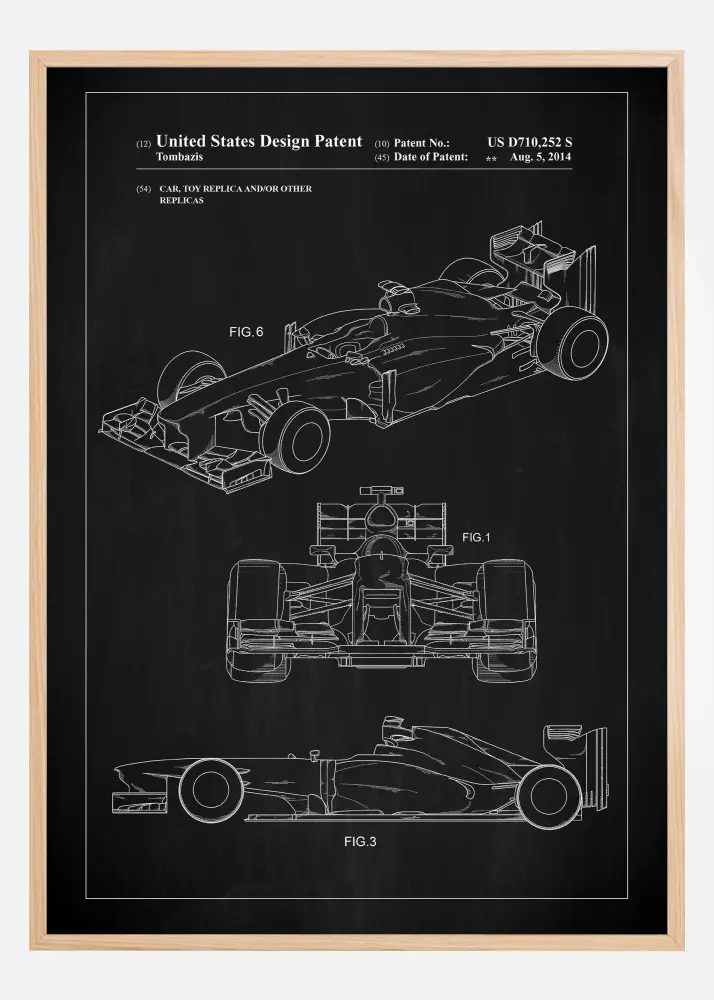 Dieser Patentposter hebt das elegante und komplexe Design eines Formel 1 Wagens hervor, gemäß US Design Patent US D710,252 S, datiert auf den 5. August 2014. Mit seinen markanten Linien und aerodynamischen Formen wird das Design des Autos aus mehreren Perspektiven eingefangen, was ein umfassendes Bild seines ikonischen und technisch fortschrittlichen Charakters vermittelt. Dieses Design ist grundlegend für die hohe Leistung und Geschwindigkeit, die mit dem Formelsport verbunden sind.