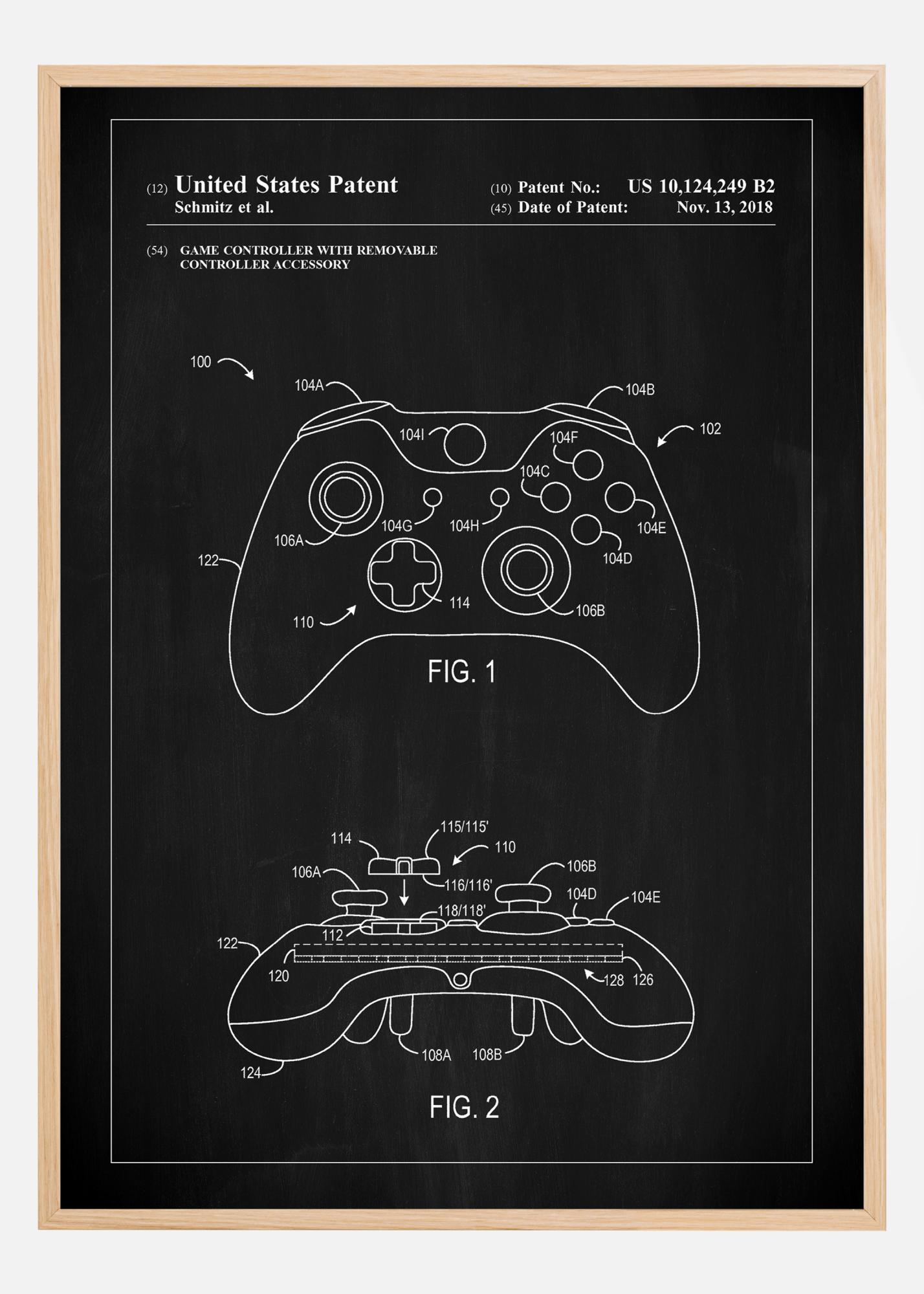 Dieser Patentposter mit einem schwarzen Tafelhintergrund hebt elegant einen modernen Xbox-Controller mit abnehmbarem Zubehör hervor, Patentnummer US 10,124,249 B2, datiert auf den 13. November 2018. Das fortschrittliche Design und seine Komponenten sind visuell im Detail dargestellt, was Einblicke in die Anpassungsmöglichkeiten von Technik und Spielerlebnis für den Benutzer bietet. Es ist eine Manifestation der kontinuierlichen Innovation, die in der Welt der Spielcontroller stattfindet.