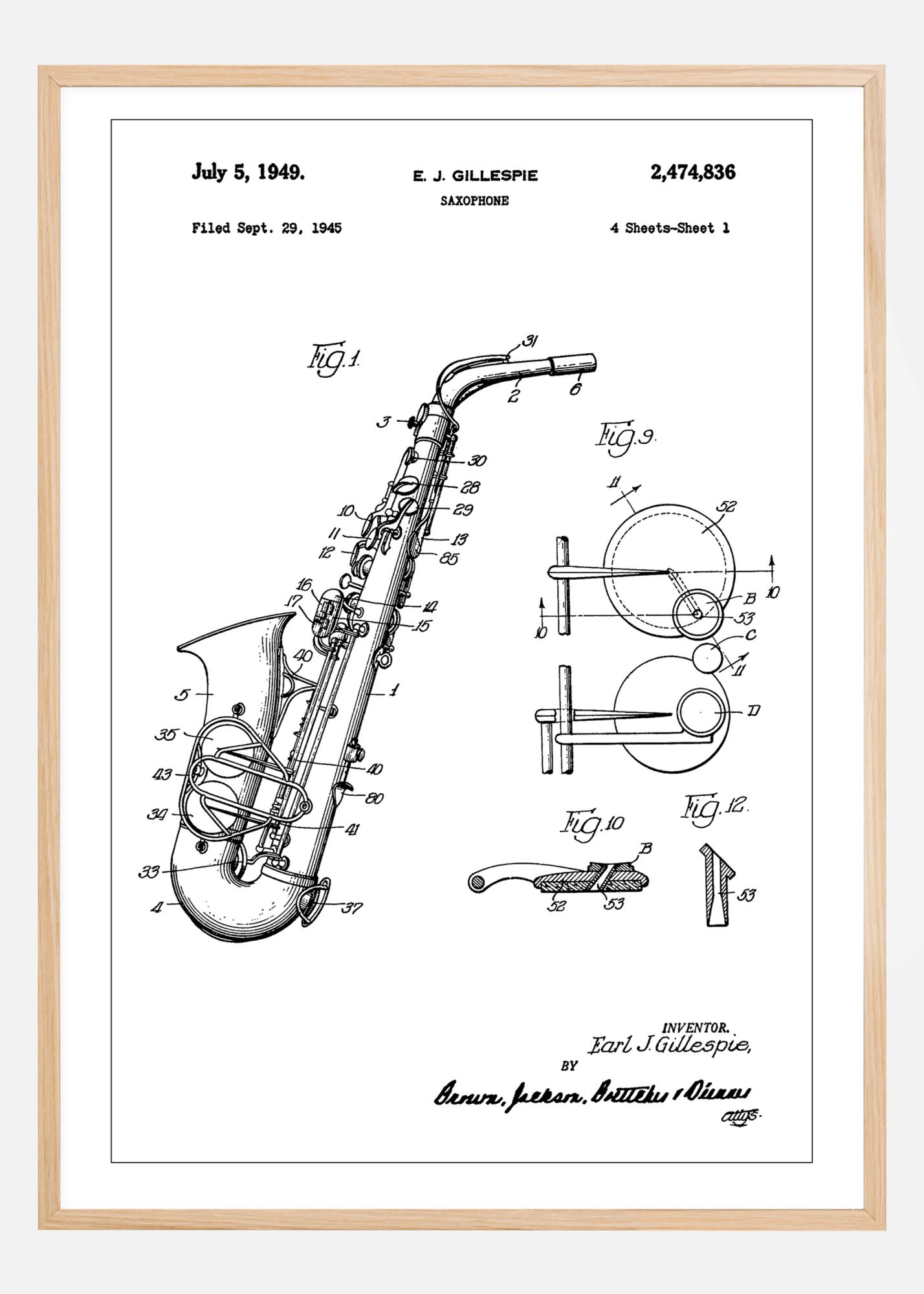 Dieser sorgfältig detaillierte Patenteintrag präsentiert eine Patentskizze eines Saxophons, datiert auf den 5. Juli 1949. Es ist ein herausragendes Beispiel für die technische Konstruktion und das Design des Musikinstruments, hervorgehoben durch die klaren Linien und präzisen Markierungen des Patents. Für Musikliebhaber, Instrumentenbauer und Kenner seltener Diagramme ist dieses Patentposter eine stilvolle Hommage an den kreativen Prozess hinter der Herstellung eines Saxophons.
