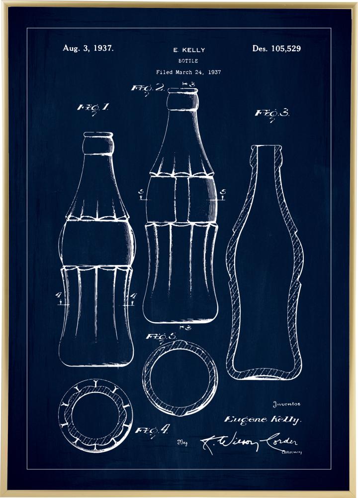 Peppen Sie Ihre Wand mit einem Poster der Patentzeichnung von der berühmten Coca Cola Flasche auf! Dieses Plakat versetzt Ihre Besucher garantiert ins Staunen. Zudem passt es perfekt zu einem retro-orientierten Einrichtungsstil. Die Zeichnung stellt die Flasche in verschiedenen Winkeln dar. Oben auf dem Bild stehen u.a. das Registrierungsdatum des Patents: 3. August 1937 sowie dessen Nummer. Die Signaturen vom Erfinder Eugene Kellys und eines Advokaten finden Sie in der rechten Ecke unten. Stilsicher wird das Motiv von einer dünnen Linie umrandet.