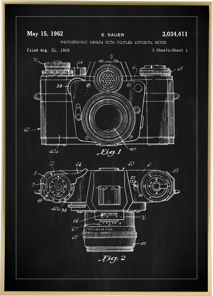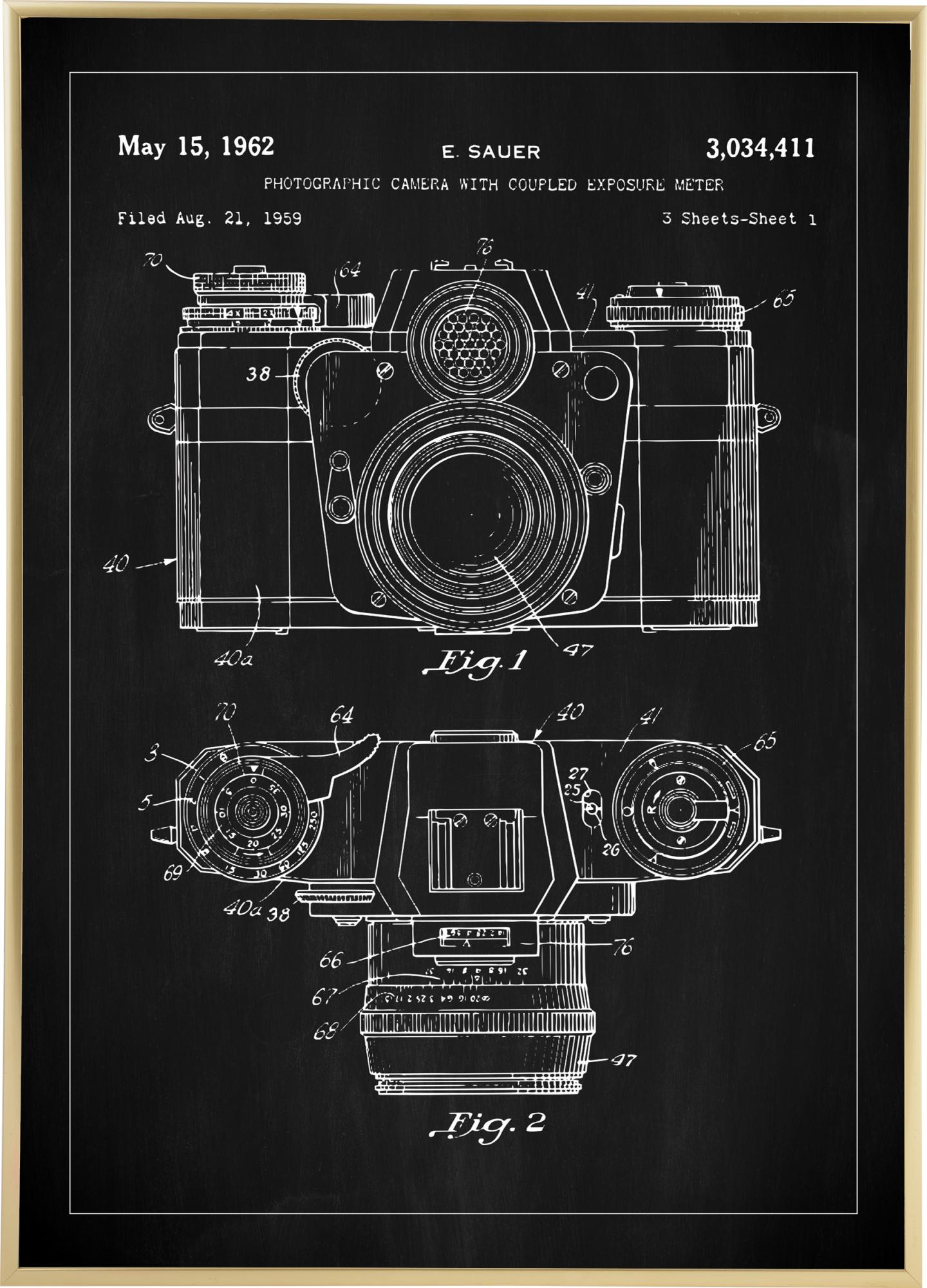 Wecken Sie mit diesem exklusiven Plakat eine tolle Retro-Atmosphäre! Es handelt sich um eine Zeichnung einer 50-er Jahre Kamera für das Patentamt, die von E. Sauer angefertigt wurde. Oben sind das Anmeldedatum: 21. August 1959, das Registrierungsdatum: 15. Mai 1962 und die entsprechende Patentnummer zu erkennen. Die Kamera wird in zwei verschiedenen Winkeln dargestellt und eine dünne Linie umrandet das Gesamtmotiv. Wählen Sie die passende Größe aus acht verschiedenen für Ihr Zuhause aus und kombinieren Sie das Motiv vielleicht mit einem unserer eleganten Rahmen.