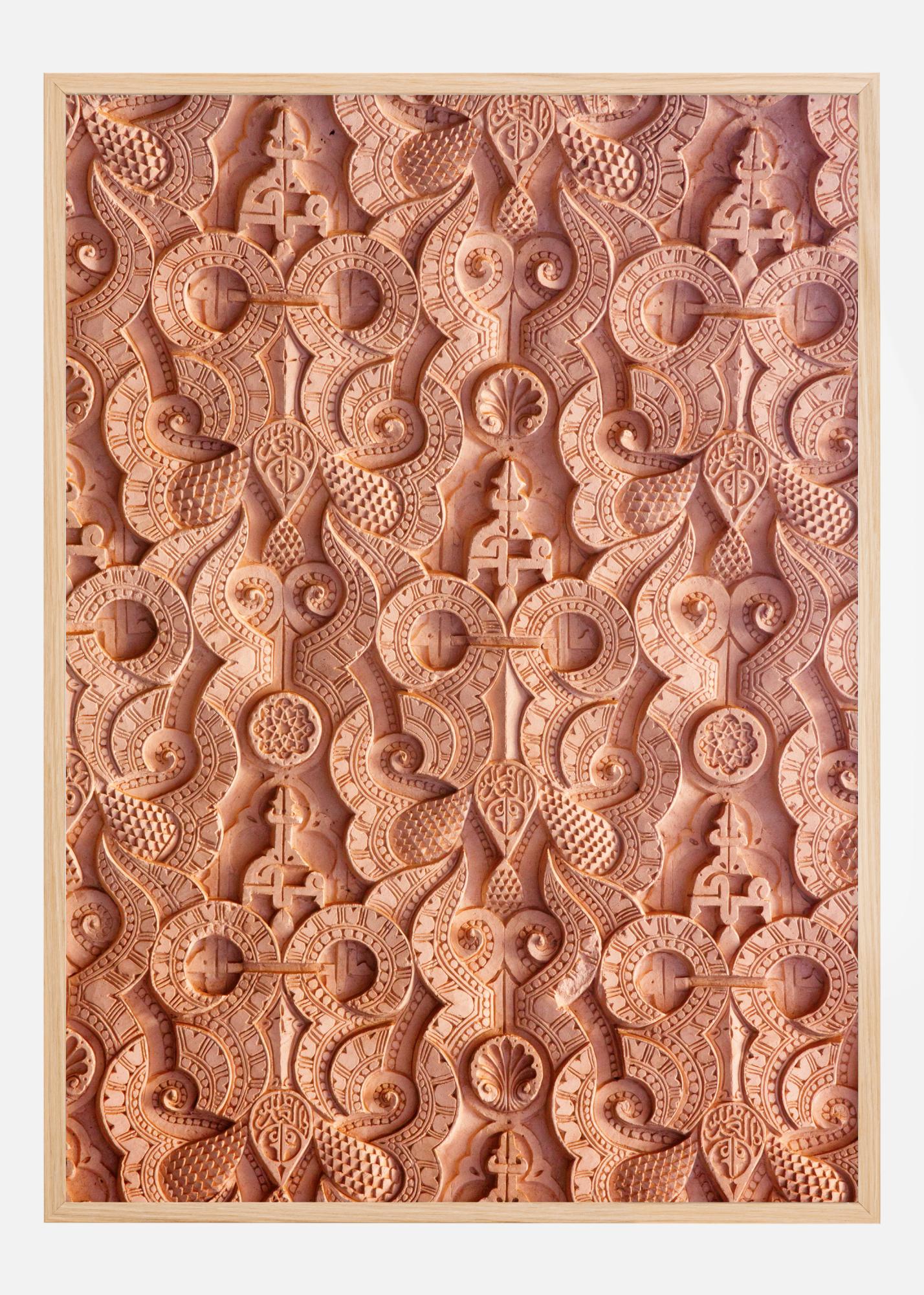 Die Farben des Motivs bewegen sich in einer Palette von warmem Terrakotta und Lehm und verleihen dem Bild ein natürliches und rustikales Gefühl. Das detaillierte Muster hebt sich gut vom einheitlichen Hintergrund ab und erzeugt eine dreidimensionale Illusion, die sowohl ansprechend als auch tief ist. Dieses Poster ist perfekt für diejenigen, die Kunst schätzen, die das Auge einfängt und zu näherem Studium einlädt, und die in ihrem Einrichtungsstil Handwerk und Tradition wertschätzen.