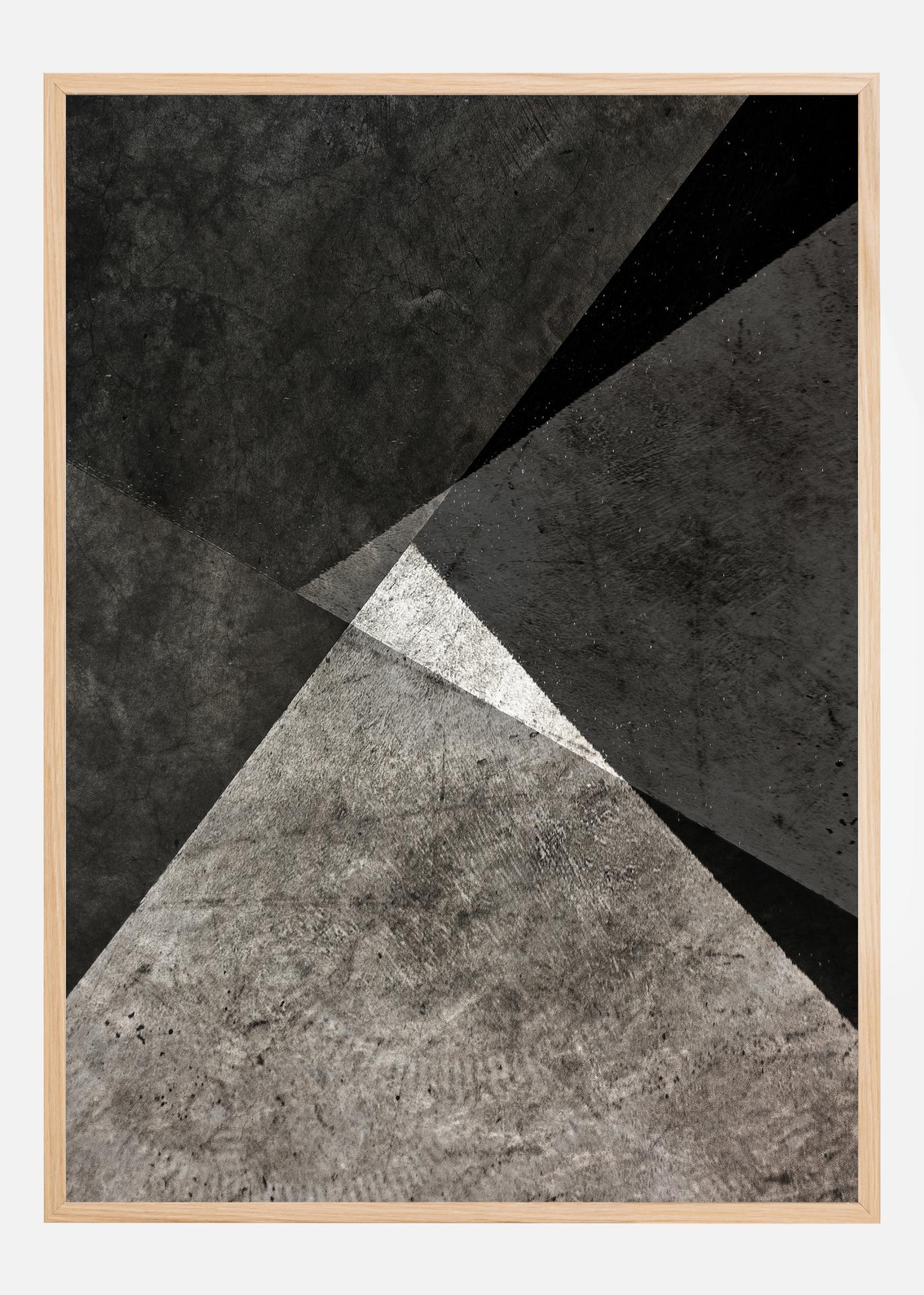 Ein mysteriöser Druck aus schwarzen und weißen dreieckigen Formen auf dem Boden. Durch das natürliche Licht, das auf die Fliesen scheint, ist es unklar, ob das kleinere Dreieck weiß ist oder nur vom Licht angestrahlt wird. Der ideale Druck, um ihn an eine schlichte Wand zu hängen.