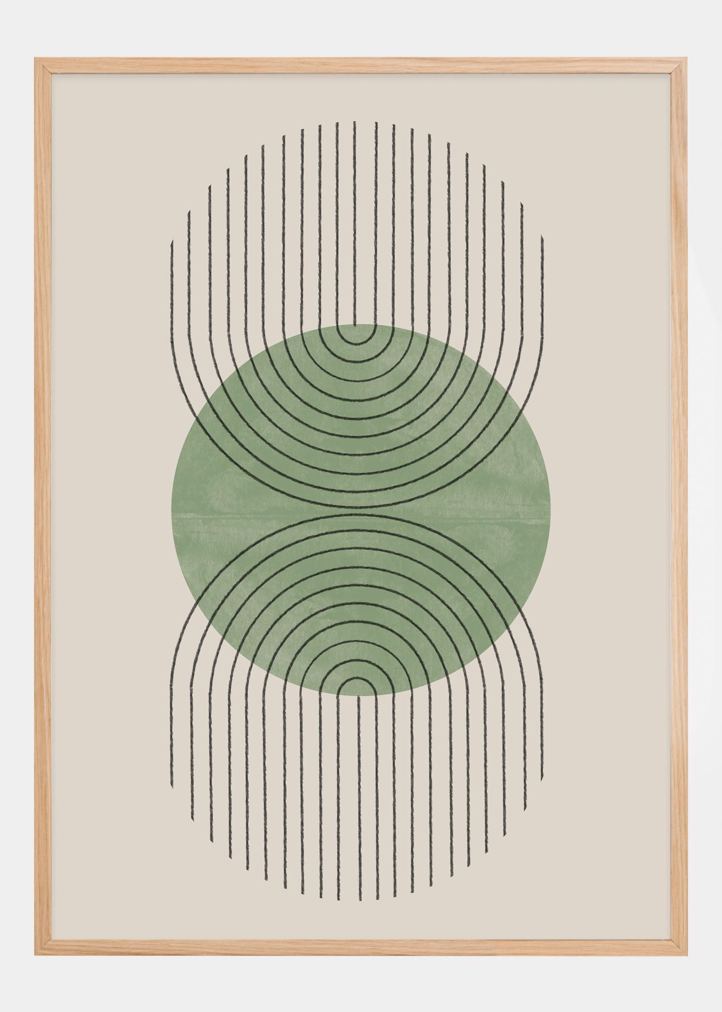 Dieses Poster ist ein minimalistisches Kunstwerk, das eine gesättigte grüne kreisförmige Form hervorhebt, umgeben von einer Reihe schwarzer Linien, die ein Gefühl von Raum und Tiefe vermitteln. Der Grünton im Kreis variiert in der Intensität, was einen visuellen Effekt von Dimension und Textur erzeugt. Die Linien, die sich vom Rand des Kreises nach außen erstrecken, schaffen einen fast hypnotischen Effekt und stellen eine geometrische Harmonie dar.