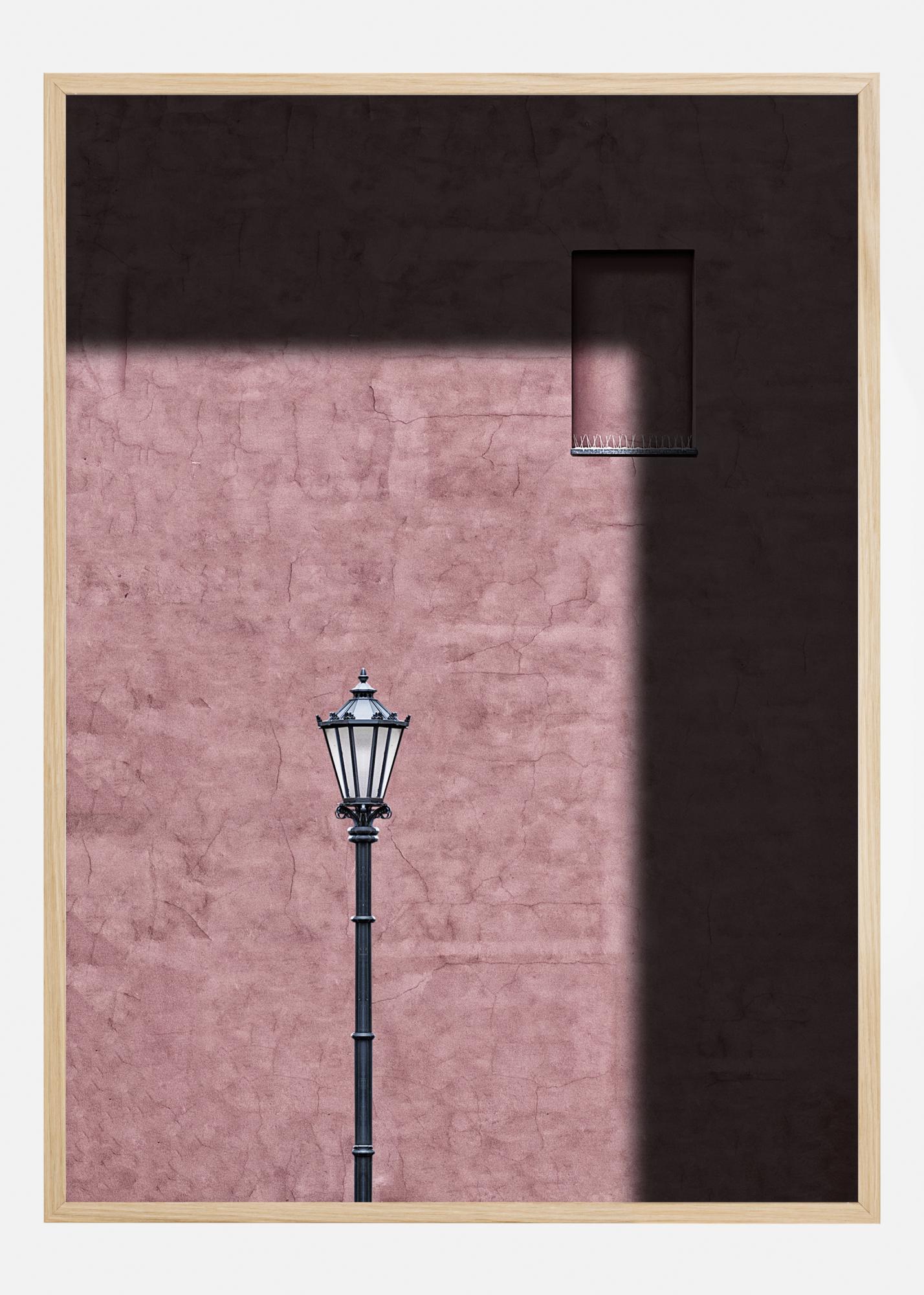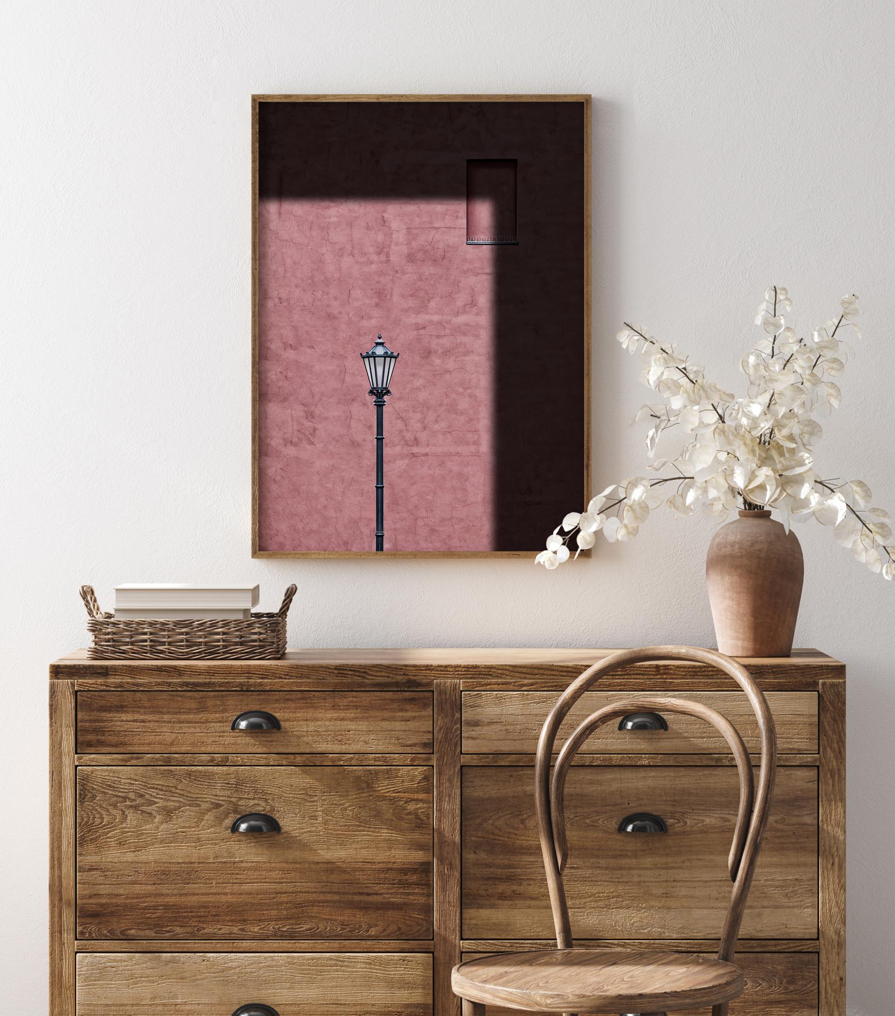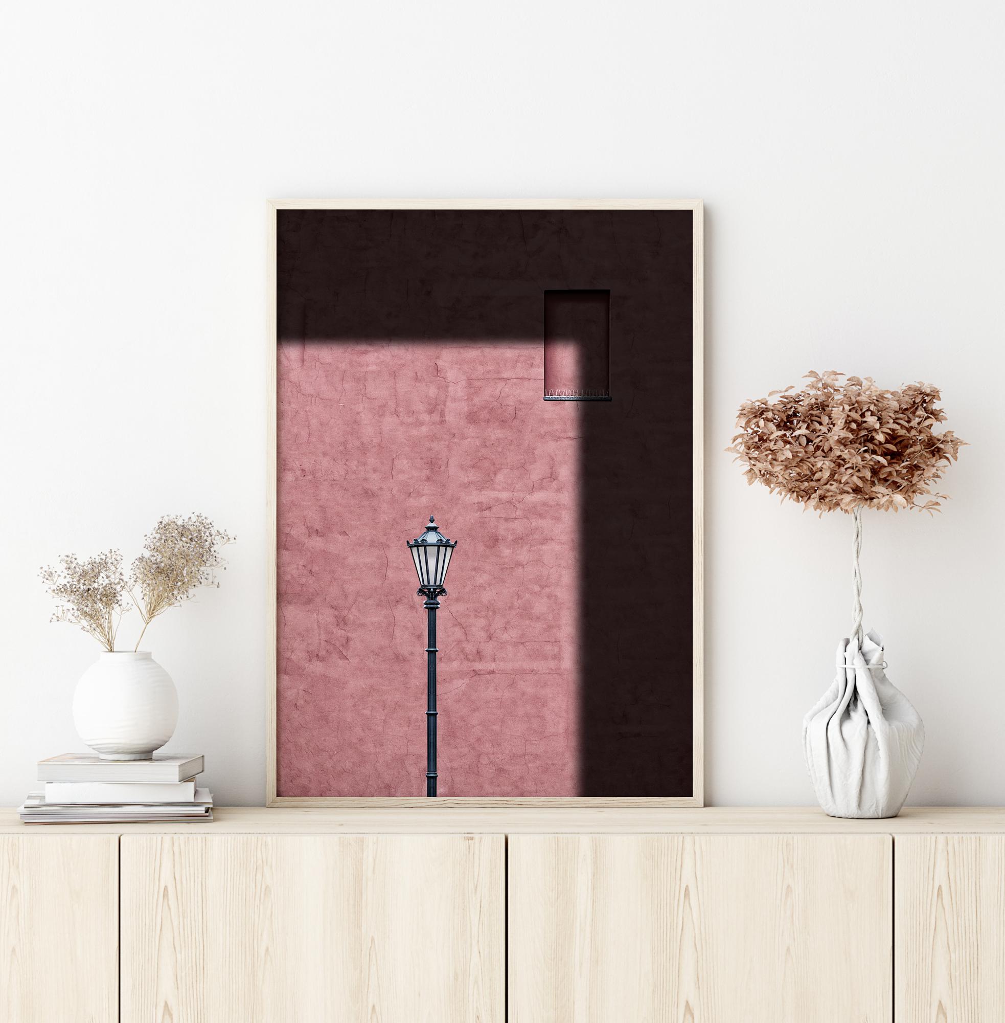 Ein farbenfroher Druck einer rosa Fassade mit einer Außenlampe in der Mitte. Das natürliche Sonnenlicht scheint auf die Wand und lässt den oberen Teil des Bildes im Dunkeln. In der oberen rechten Ecke ist ein kleines eingemauertes Fenster zu sehen. Bringen Sie mit diesem zartrosa Druck etwas Licht in Ihr Zuhause.