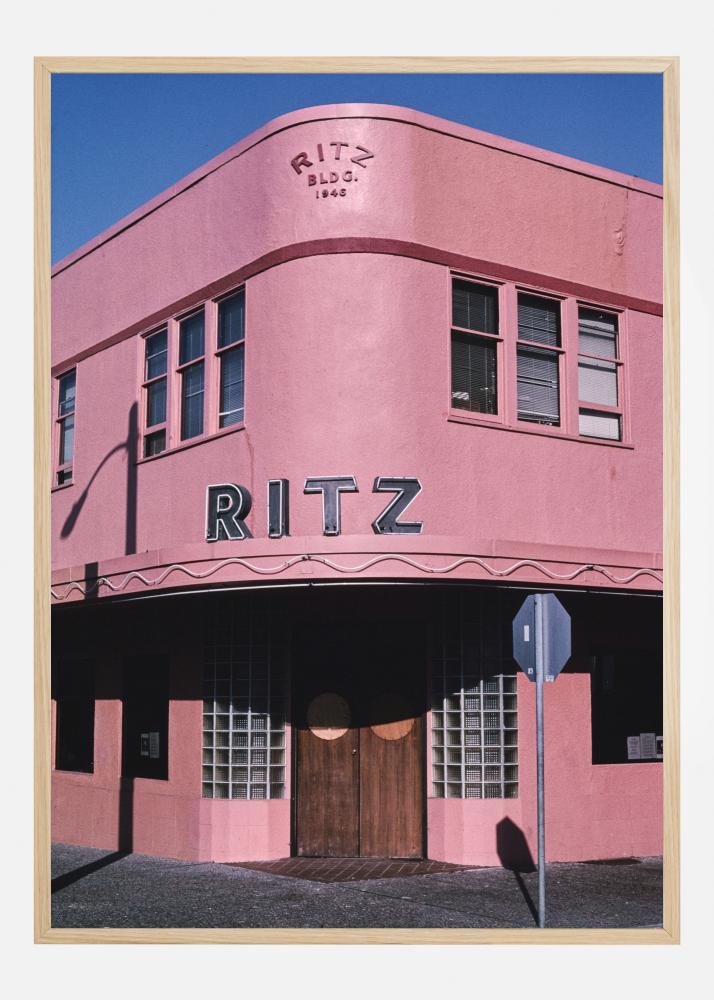 Ein leuchtendes Bild des zweistöckigen Ritz-Gebäudes in Rosa. Der dunkelblaue Himmel hebt das dunkelrosa Gebäude und die dunkelbraune Eingangstür hervor. Das Sonnenlicht reflektiert den Schatten eines Laternenpfahls und eines Straßenschilds an der Fassade des Gebäudes. Ein perfekter Druck für Liebhaber der Ära 1940.