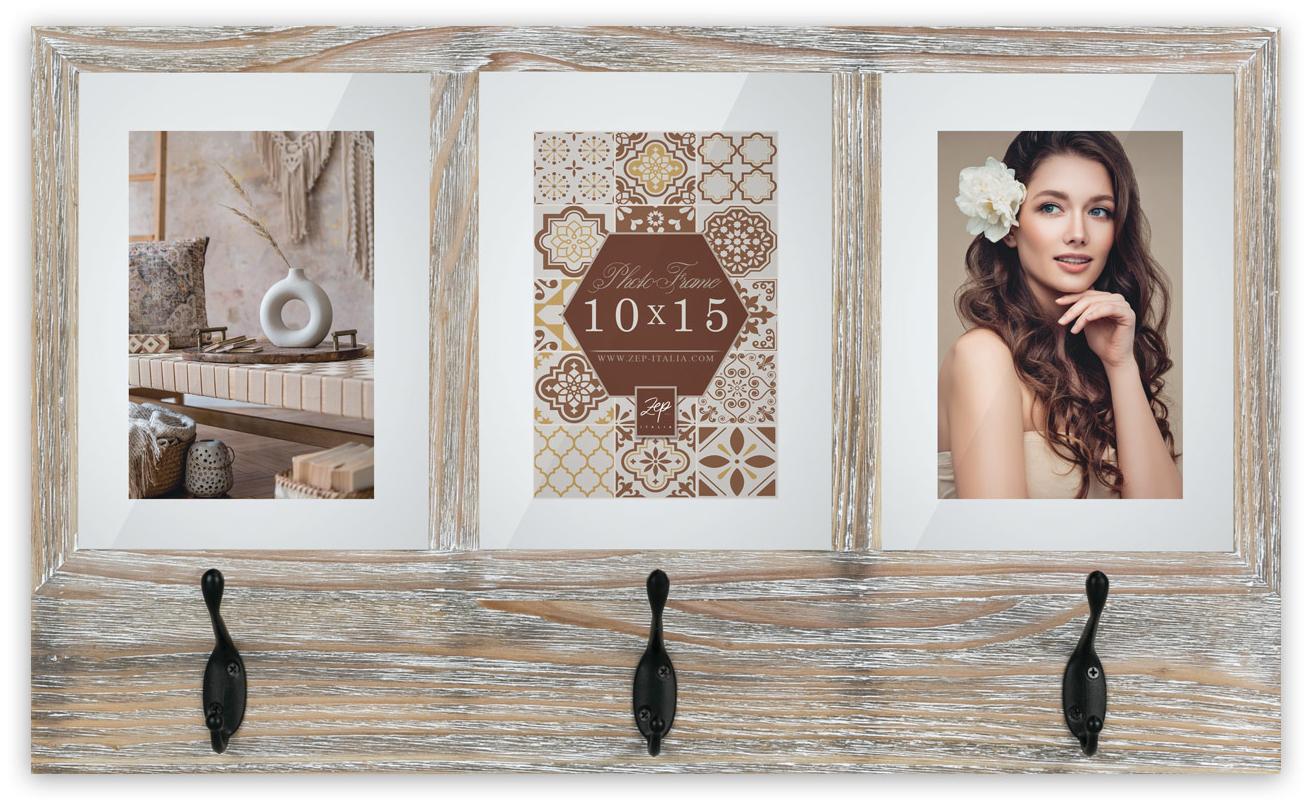 Schöner Collage-Bilderrahmen aus Holz, der 3 Bilder im Format 10x15 cm gekonnt in Szene setzt. Am unteren Teil des Collagerahmens befinden sich 3 dekorative Haken. Hier können z.B. hübsche Accessoires als zusätzliche Wanddekoration aufgehängt werden. Der Collagerahmen ist aus Holz gefertigt. Die weißgesprenkelten Einschläge verleihen dem Collagerahmen einen charmanten ländlich-rustikalen Touch. Der Bilderrahmen ist mit einer Wandhalterung ausgestattet.
