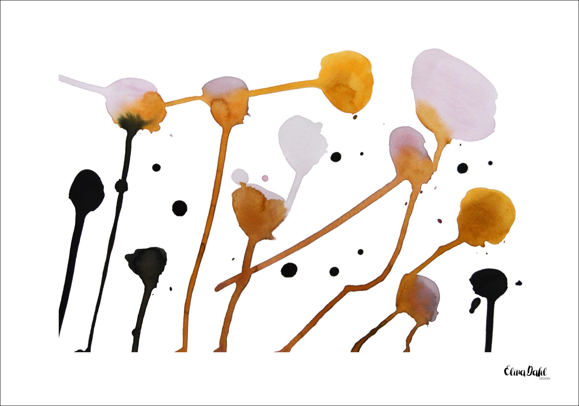 Ein botanisches Bild mit orangefarbenen, rosafarbenen und schwarzen Blumenstängeln. Die verschiedenfarbigen Blumenstängel wurden auf einer weißen Oberfläche gemalt und mit schwarzen Punkten zwischen den Stängeln versehen. Bringen Sie dieses Bild an einer kahlen Wand an, um eine stilvolle Atmosphäre zu schaffen.