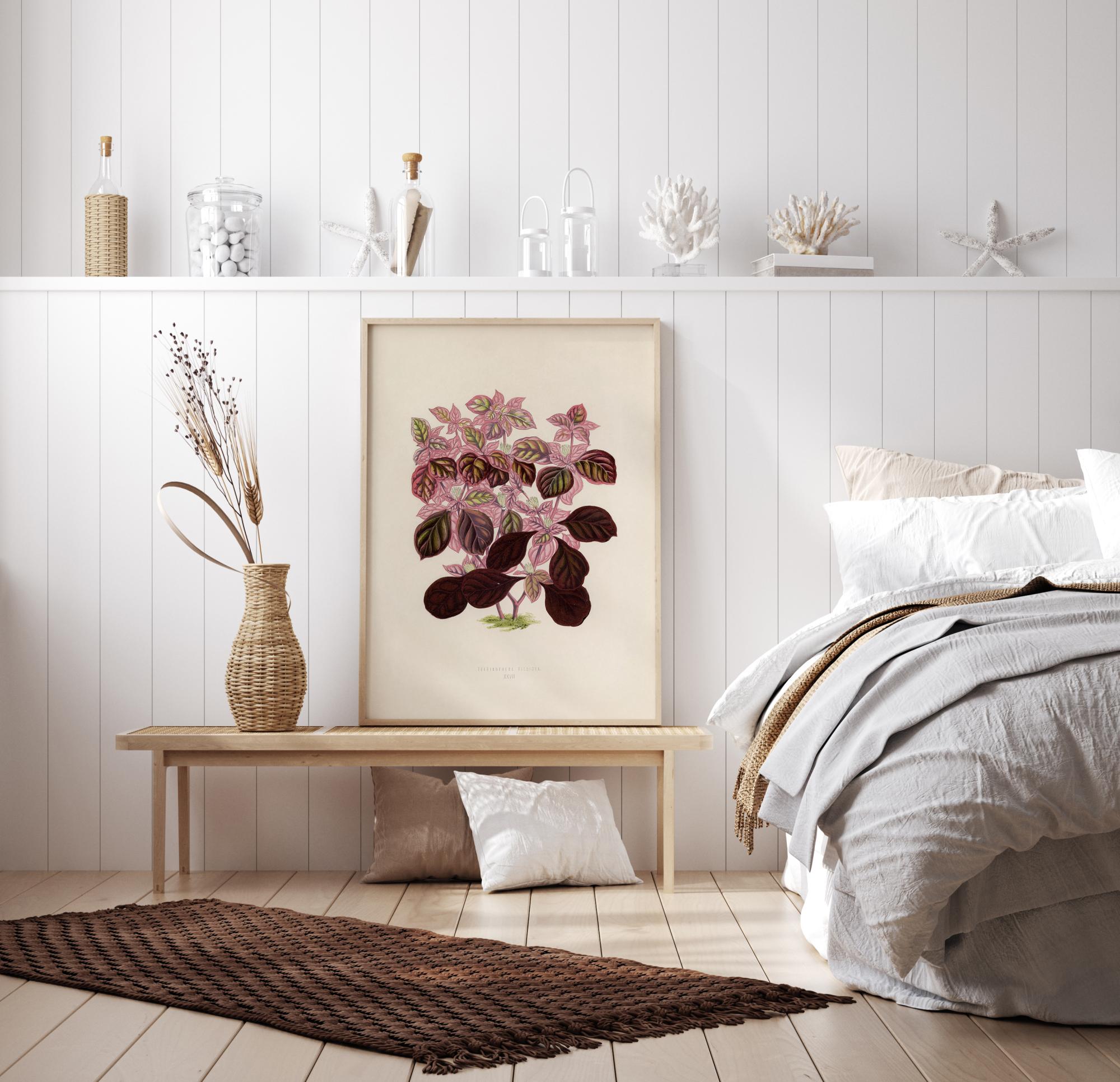 Ein schöner Handabdruck von zwei rosa Plectranthus scutellarioides. Der zarte beigefarbene Hintergrund hebt die schönen Rosa- und Grüntöne hervor. Die weinroten Farbtöne an der Wurzel der Pflanze verleihen dem Bild einen Hauch von Wärme. Ergänzen Sie Ihre Kunstsammlung zu Hause mit diesem Druck.