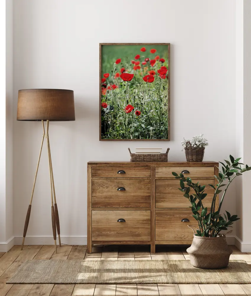 Eine wunderschöne Nahaufnahme eines Mohnfeldes. Das dunkelgrüne Gras unterstreicht die Helligkeit der Mohnblumen und verleiht ihnen eine frische Ausstrahlung. Die Mohnblumen stehen hoch auf dem Feld, während das Gras breit wächst. Ein entspannender und reizvoller Druck, der in Ihrem Schlafzimmer hängen sollte.