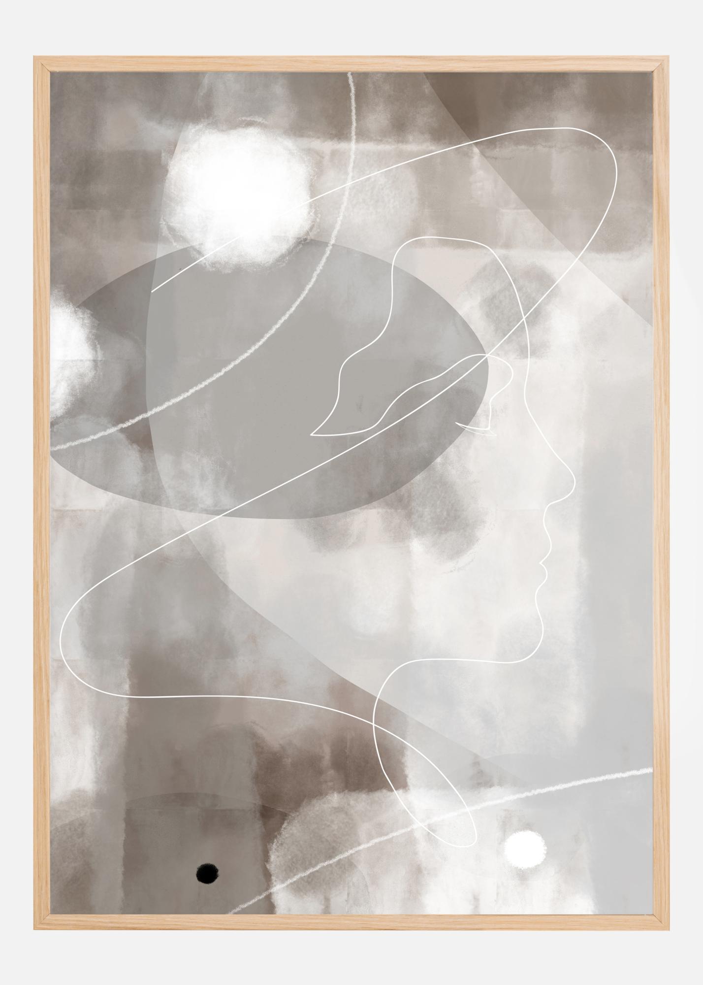 Ein Kunstwerk, das eine Frau mit einem Hut zeigt. Dieses schöne Profilbild wurde geschickt gezeichnet, ohne den Pinsel aus der Hand zu legen. Der Umriss der Frau ist auf einem hellbraunen Hintergrund mit einigen weißen Wolken im oberen Teil des Bildes zu sehen. Ein schöner Druck für das Schlafzimmer einer Frau.