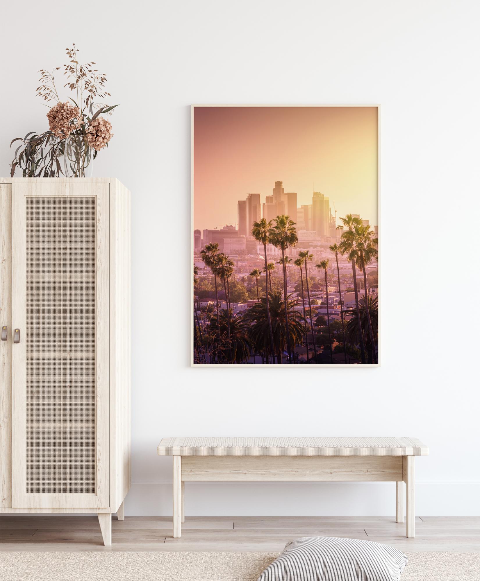 Ein Druck einer Stadt aus der Ferne. Im Vordergrund dominieren die hohen Palmen das Bild, während in der Ferne die Wolkenkratzer auf die Stadt herabschauen. Der orange- und lilafarbene Himmel spiegelt sich in den Gebäuden der Stadt und verleiht ihr ein lilafarbenes Aussehen. Ein idealer Druck für jeden, der Architektur liebt.