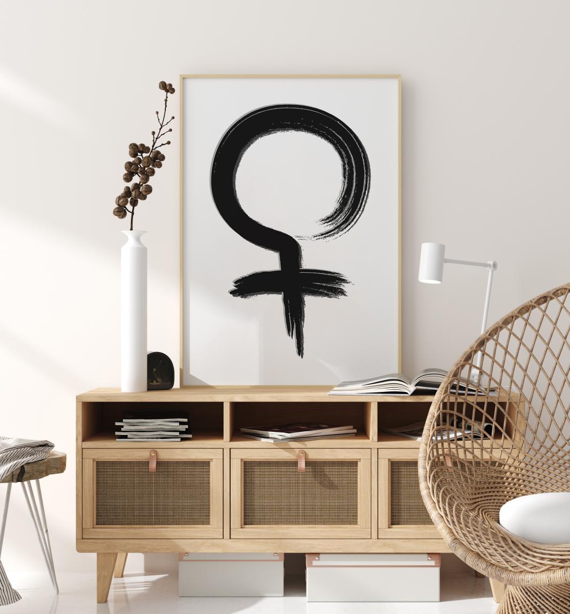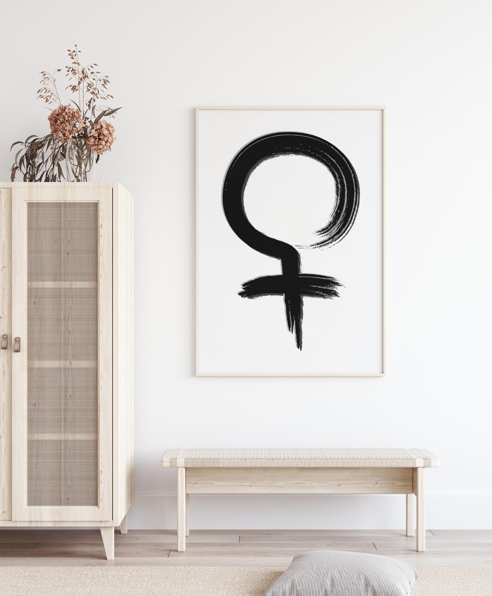 Ein einfacher Schwarz-Weiß-Druck, der das weibliche Geschlechtszeichen mit einem unvollständigen Kreis darstellt. Auf weißem Hintergrund ist das schwarze Symbol zum Ende des Rings hin verblasst. Ein perfekter Druck zum Aufhängen in einer weiblichen Umgebung.