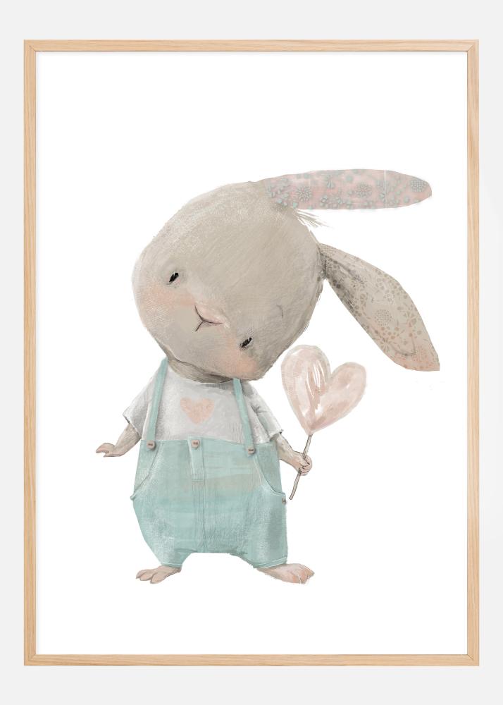Dieses bezaubernde Poster zeigt ein kleines Kaninchen, das einen herzförmigen Ballon hält, gemalt mit Raffinesse und einem Gefühl durch Aquarellmalerei. Der sanfte, träumerische Blick des Kaninchens und die feine Detailgenauigkeit in seiner Kleidung, die pastellfarbene Blumenmuster einschließt, vermitteln ein Gefühl von Unschuld und Reinheit. Diese Illustration ist eine entzückende Hommage an Liebe und Fürsorge, hervorgebracht durch den herzförmigen Ballon.