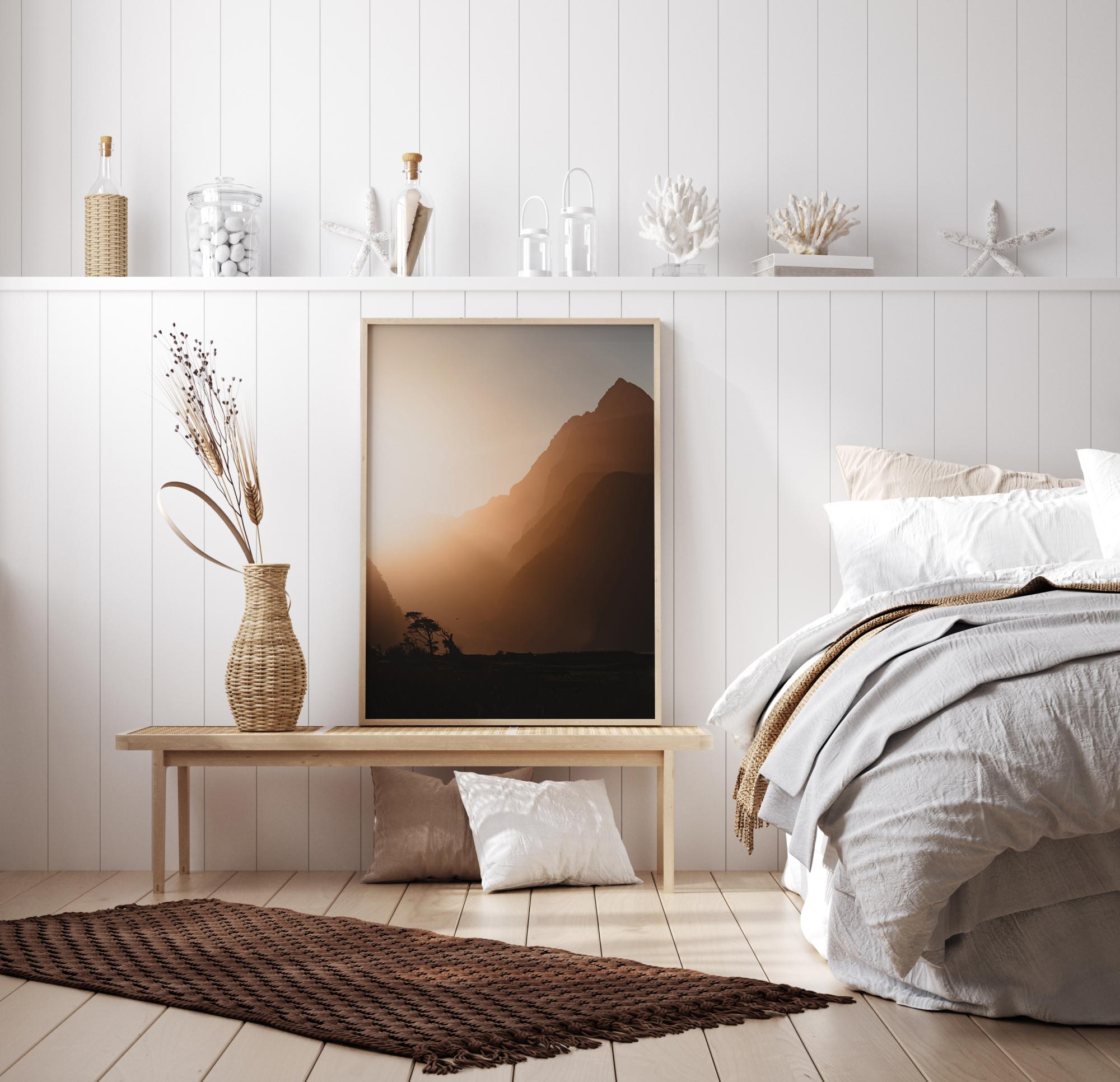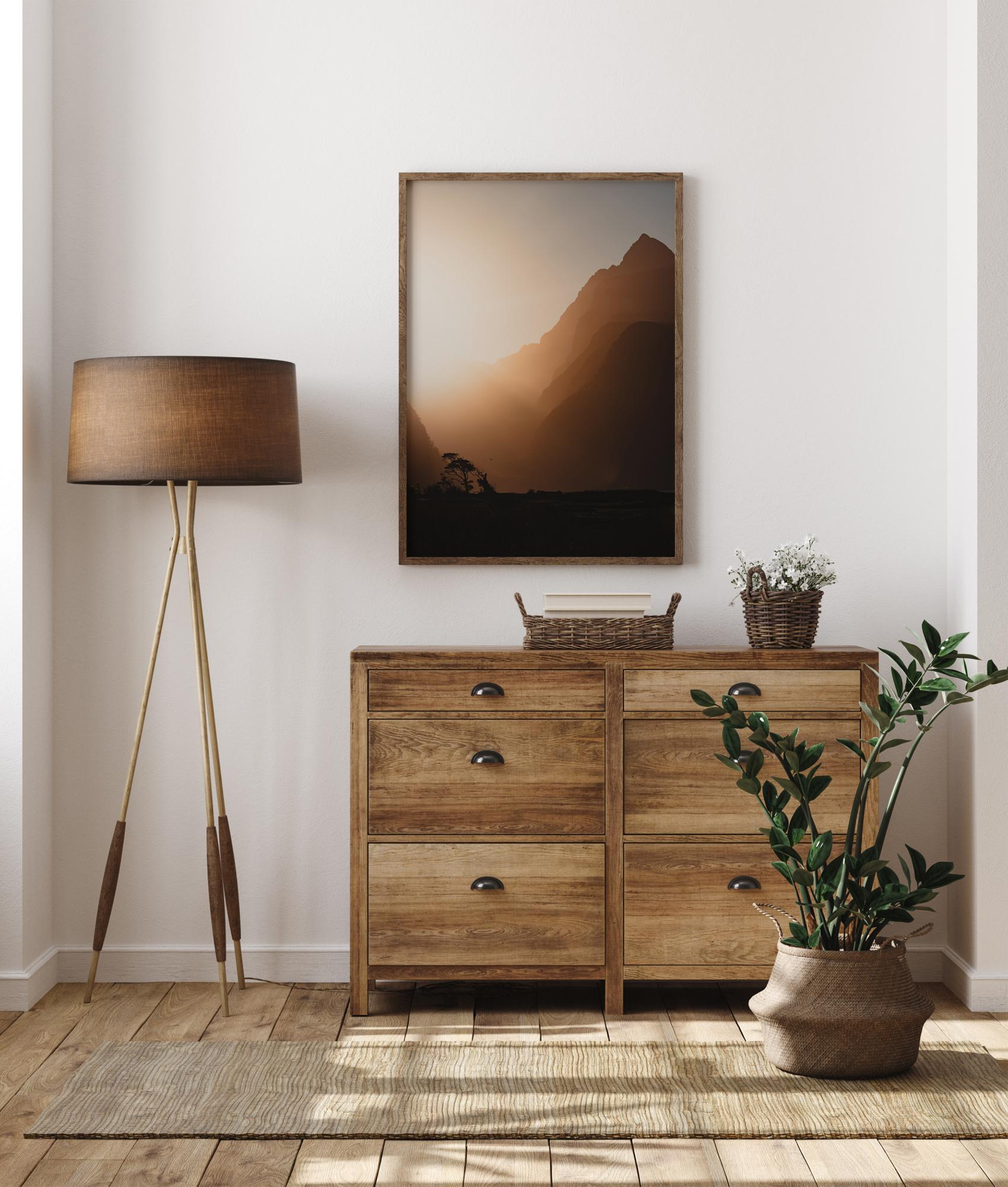 Ein wunderschönes Poster einer Landschaft bei Sonnenuntergang. Die Lücke zwischen den Hügeln leuchtet mit hellen, blendenden Strahlen und schafft einen dunklen Vordergrund. Die entfernten Bäume und der Vogel zeigen die Existenz des Lebens. Dekorieren Sie Ihr Schlafzimmer mit diesem lebendigen Poster.
