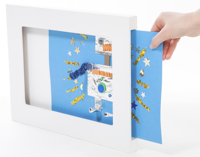 Bilderrahmen für selbstgemalte Kinderbilder sind immer ein schönes persönliches Geschenk, das in Familie und im Freundeskreis Freude bringt. Auch die kleinen Künstler werden es sicherlich toll finden, ihre eigenen Werke in angemessenen Bilderrahmen an der Wand aufhängen zu können und damit die Wände im eigenen Kinderzimmer zu schmücken. Dieser hübsche Bilderrahmen passt zu jedem Wohnstil und kann überall Einsatz finden. Da der Bilderrahmen ohne Glas auskommt, können nicht nur Bilder, sondern auch andere kleine 3D-Kunstwerke stilvoll eingerahmt werden. Warum nicht ein hübsches Bild mit kleinen Papierteilchen, Perlen oder sonstigen Bastelmaterialien verschönern und ein einzigartiges Kunstwerk schaffen? Raum für Fantasie und für schöne, persönliche Wanddekoration!