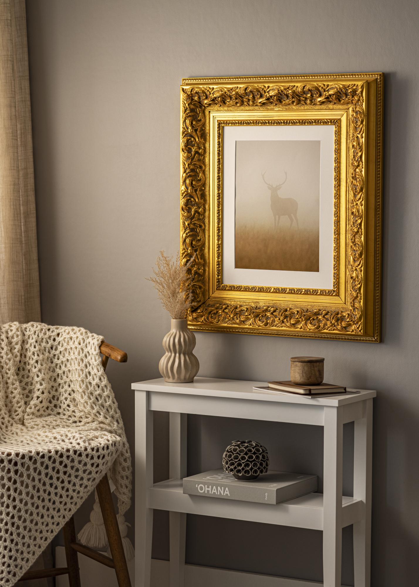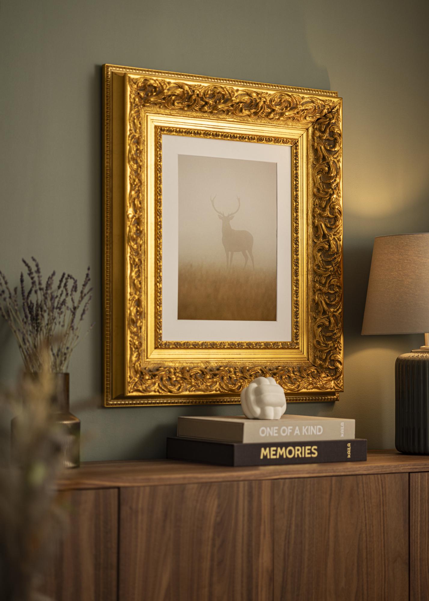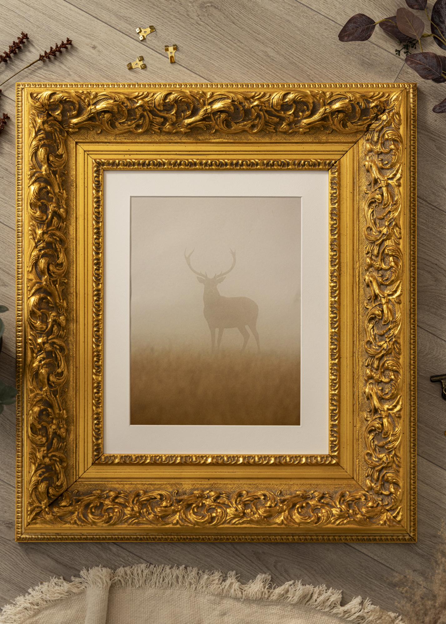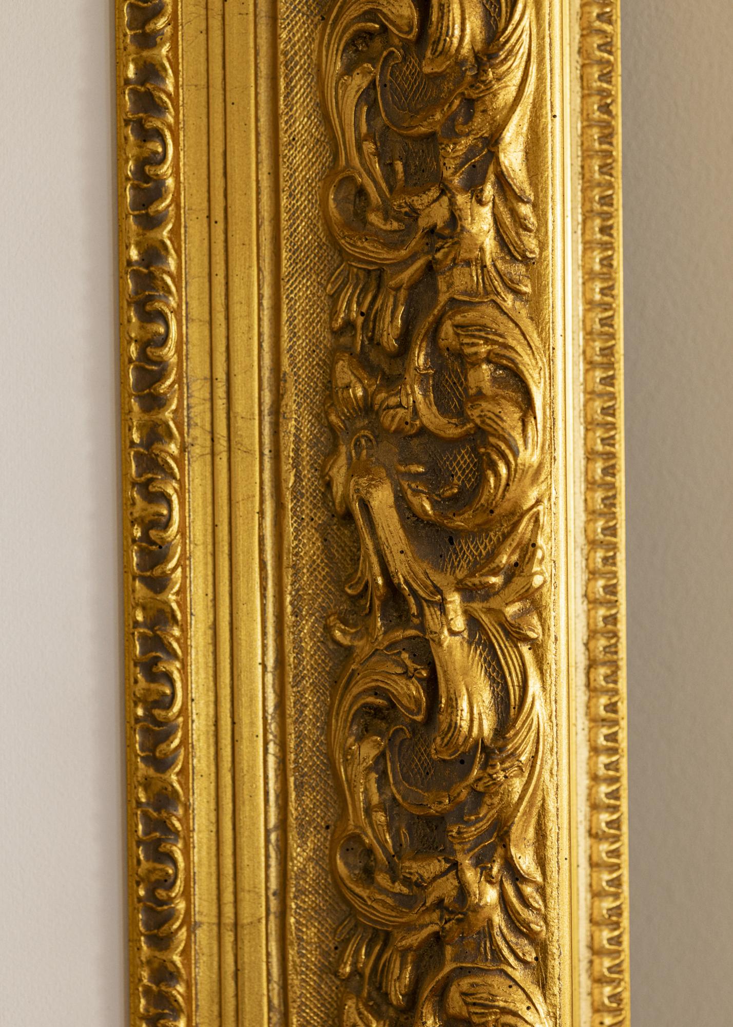 Unser Rahmen Birmingham Gold ist ein maßgefertigter Bilderrahmen, der in unserer eigenen Rahmenwerkstatt hergestellt wird. Mit seinem tiefen Goldton und klassischen Barockdesign wird er in jedem Raum zu einem eleganten Highlight. Dieser Fotorahmen hat eine 152 mm breite Rahmenleiste und eine Tiefe von 74 mm, was ihm eine beeindruckende Präsenz an der Wand verleiht.