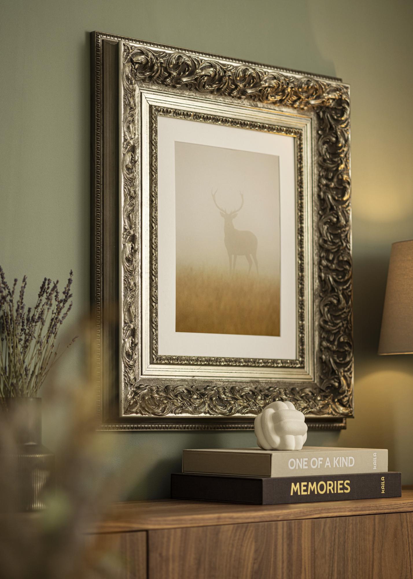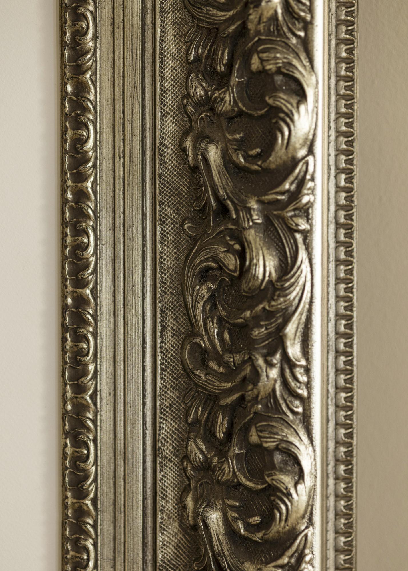Dieser reich verzierte Rahmen in Antiksilber hat aufwendige Details und eine schöne Patina, die ein Gefühl von Eleganz und Zeitlosigkeit vermittelt. Das tiefe Relief betont die skulptierten Blattmuster und macht ihn zu einer perfekten Wahl für klassische Motive und Einrahmungen, die einen markanten und dekorativen Bilderrahmen erfordern.