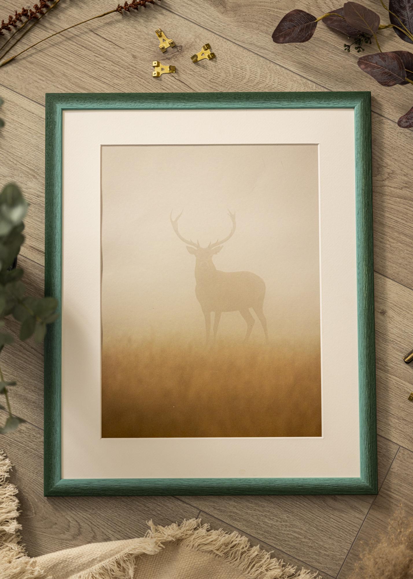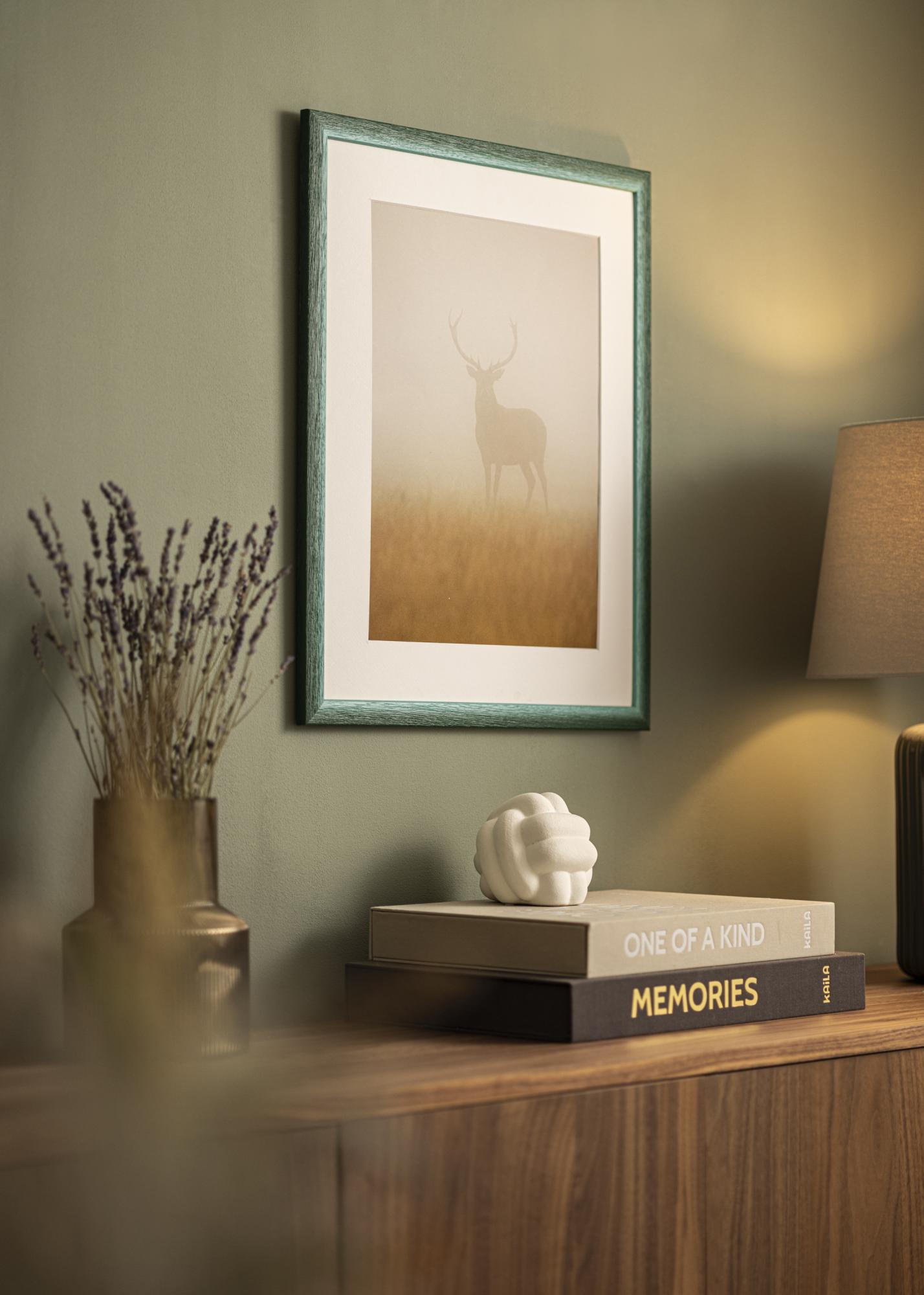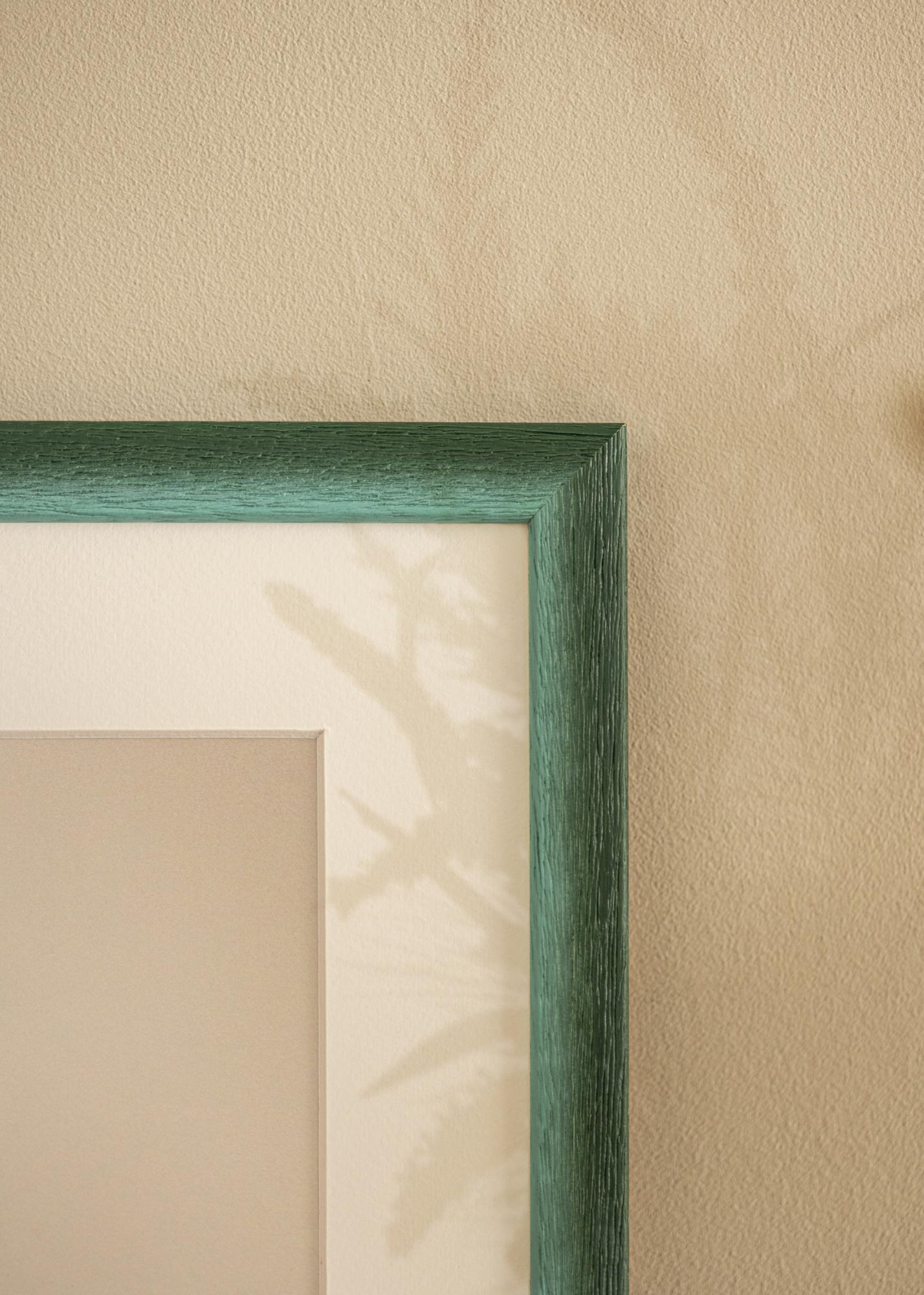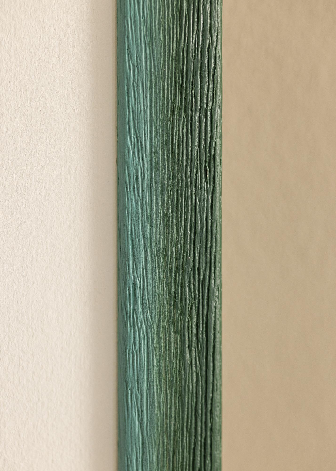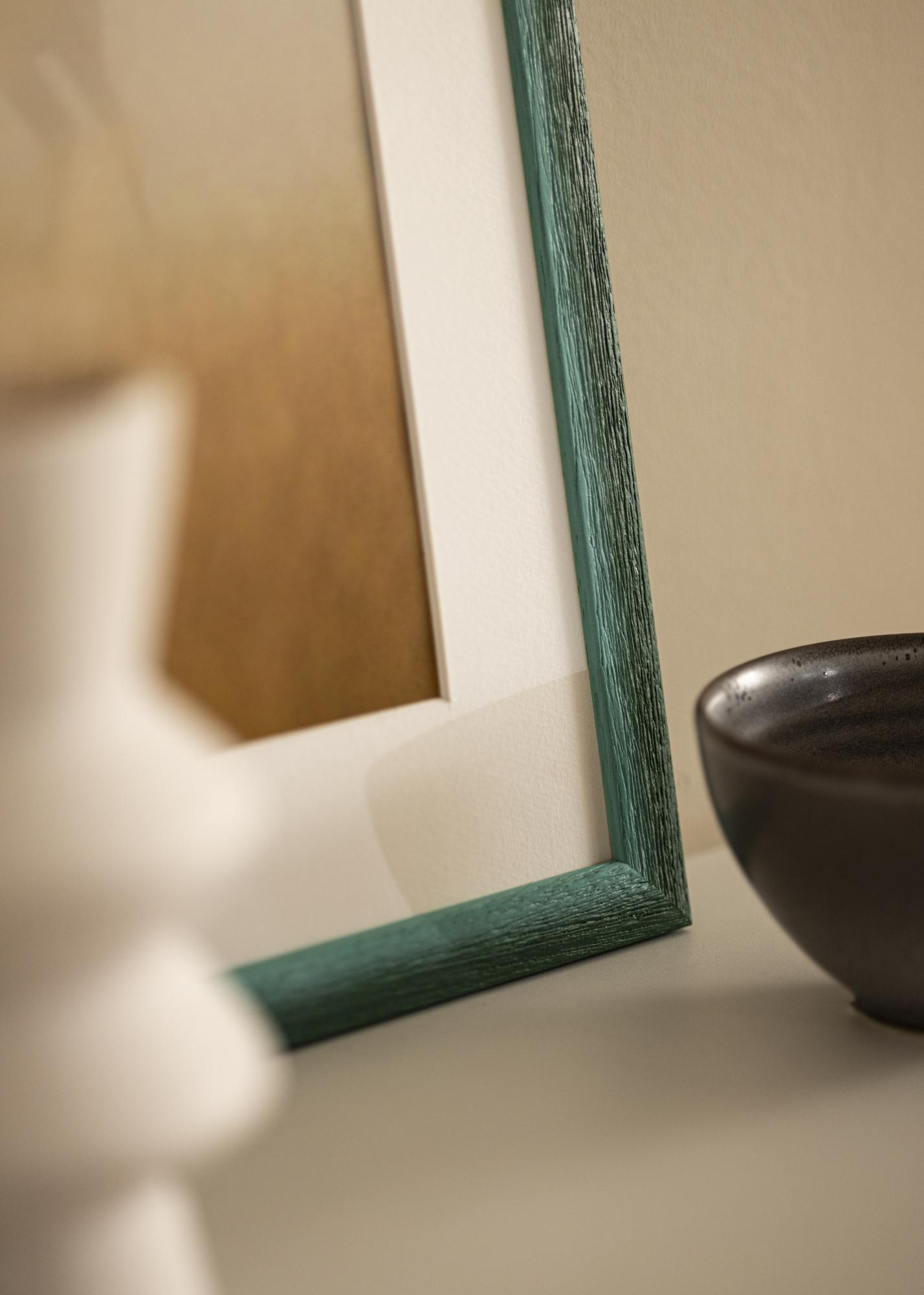 Die gedämpfte grüne Farbe hat subtile Variationen, die einen lebendigen und natürlichen Ausdruck verleihen, während die markante Holzstruktur mit tiefen Maserungen ein rustikales Gefühl erzeugt. Die Oberfläche hat ein mattes Finish, das die Intensität der Farbe mindert und einen weichen Eindruck vermittelt, sodass Ihre Bilder wirklich im Mittelpunkt stehen können. Die schmale Profilbalanciert den rustikalen Look mit moderner Schlichtheit.