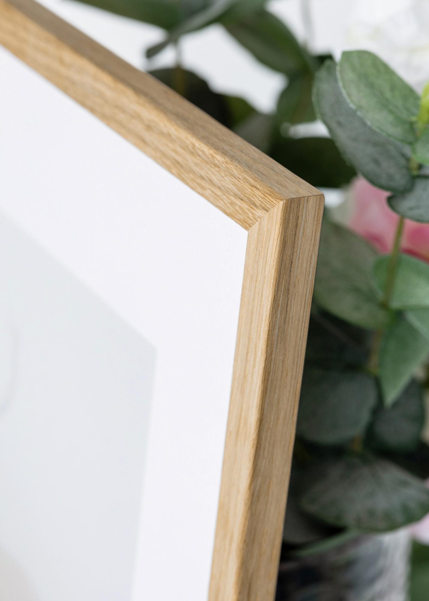 Manchmal werden wir gefragt, warum der Bilderrahmen aus Eichenfurnier und nicht aus echtem massiven Eichenholz besteht, wo es sich doch um einen Qualitätsrahmen handelt. Der Grund dafür ist, dass es schwierig ist, eine balancierte Oberfläche zu erhalten, wenn nur mit Eichenholz gearbeitet wird. Oft kommt es zu Farbveränderungen an verschiedenen Teilen des Holzes, was in einigen Zusammenhängen gut passt. Bei einem Bilderrahmen besteht jedoch die Gefahr, dass diese verschiedenen Farbtöne als störende Verfärbungen wahrgenommen werden.