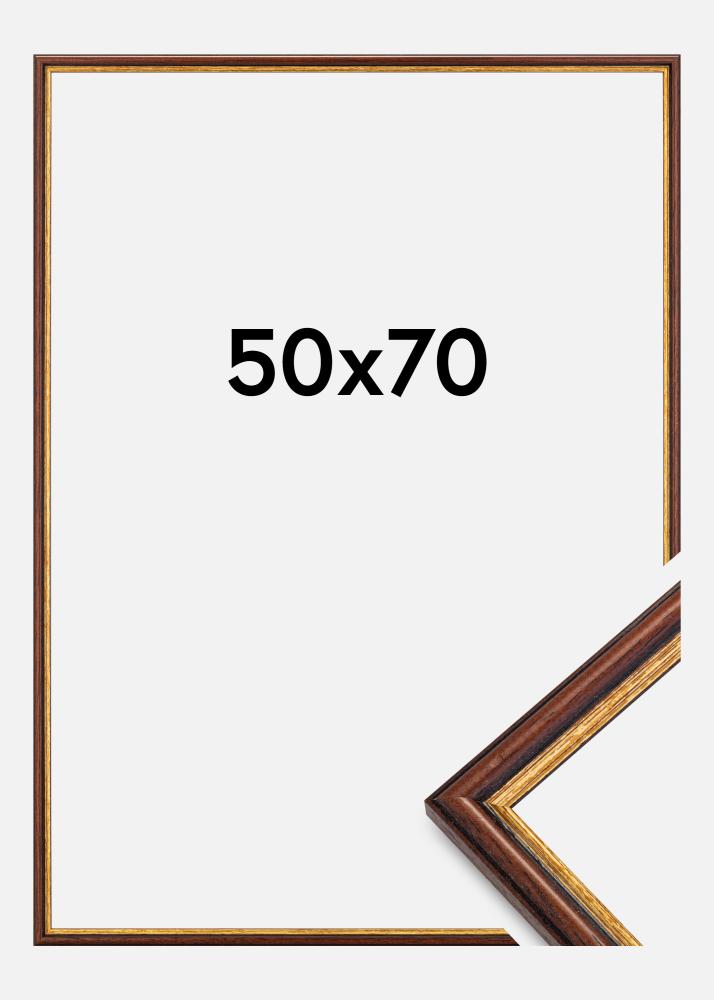 Entdecken Sie die Eleganz unseres klassischen Bilderrahmens in der Größe 50x70 cm, der mit seiner braunen Farbe und der markanten Goldkante einen zeitlosen Charme ausstrahlt. Dieser Rahmen ist die perfekte Wahl, um Ihre Lieblingskunstwerke oder Fotos mit einem Hauch von traditionellem Stil hervorzuheben.