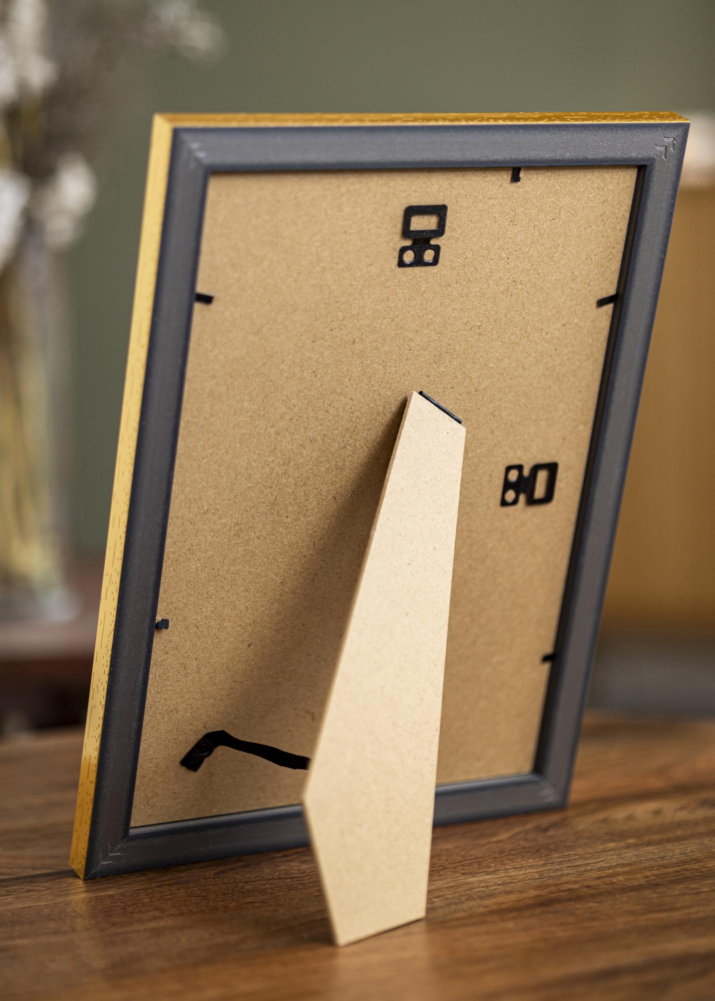 Verwandeln Sie Ihre Bilder in Kunstwerke mit unserem eleganten, goldfarbenen Rahmen, komplett mit einem stilvollen weißen Passepartout. Dieser Rahmen ist so gestaltet, dass er Bilder in der Größe 15x21 cm (A5) passt und hat eine Gesamtaußenmaß von 24x34 cm. Mit einer Breite von 26 mm und einer Tiefe von 19 mm bietet der Rahmen eine robuste und raffinierte Einrahmung, die Ihre Lieblingsbilder hervorhebt.