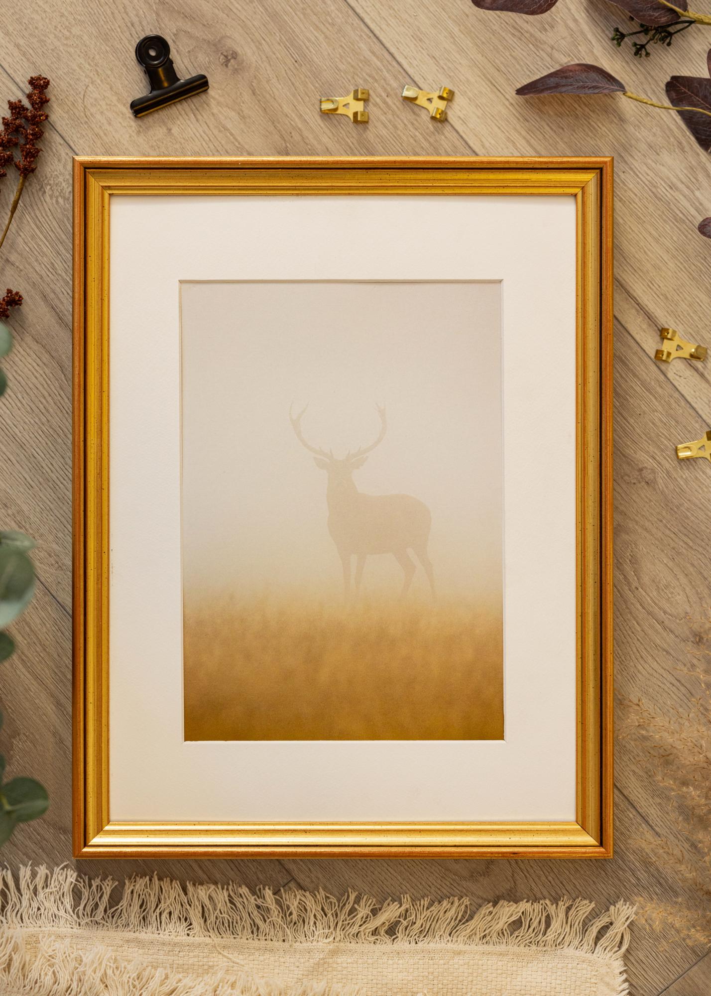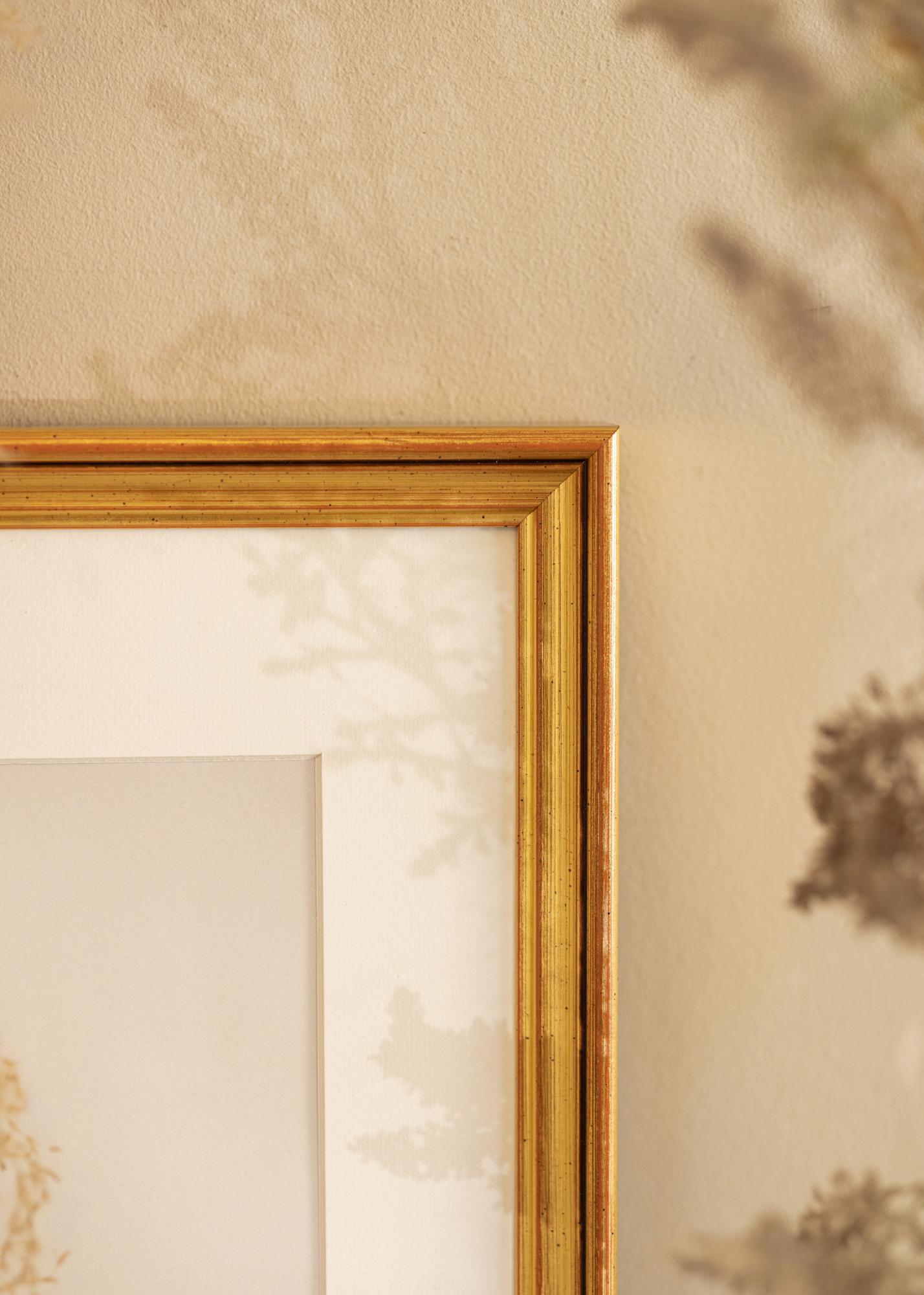 Rahmen Loki Gold ist ein eleganter und klassischer Fotorahmen, der Ihren Kunstwerken und Fotografien einen anspruchsvollen Rahmen verleiht. Mit seinem schlanken Profil und dezenten patinierten Details bietet dieser goldene Rahmen einen zeitlosen Charakter, der sowohl in modernen als auch in traditionellen Umgebungen perfekt passt. Die goldene Oberfläche hat ein leicht antikes Finish mit kleinen dunklen Details, was sein elegantes Aussehen unterstreicht und ein Gefühl von Tiefe und Geschichte erzeugt.
