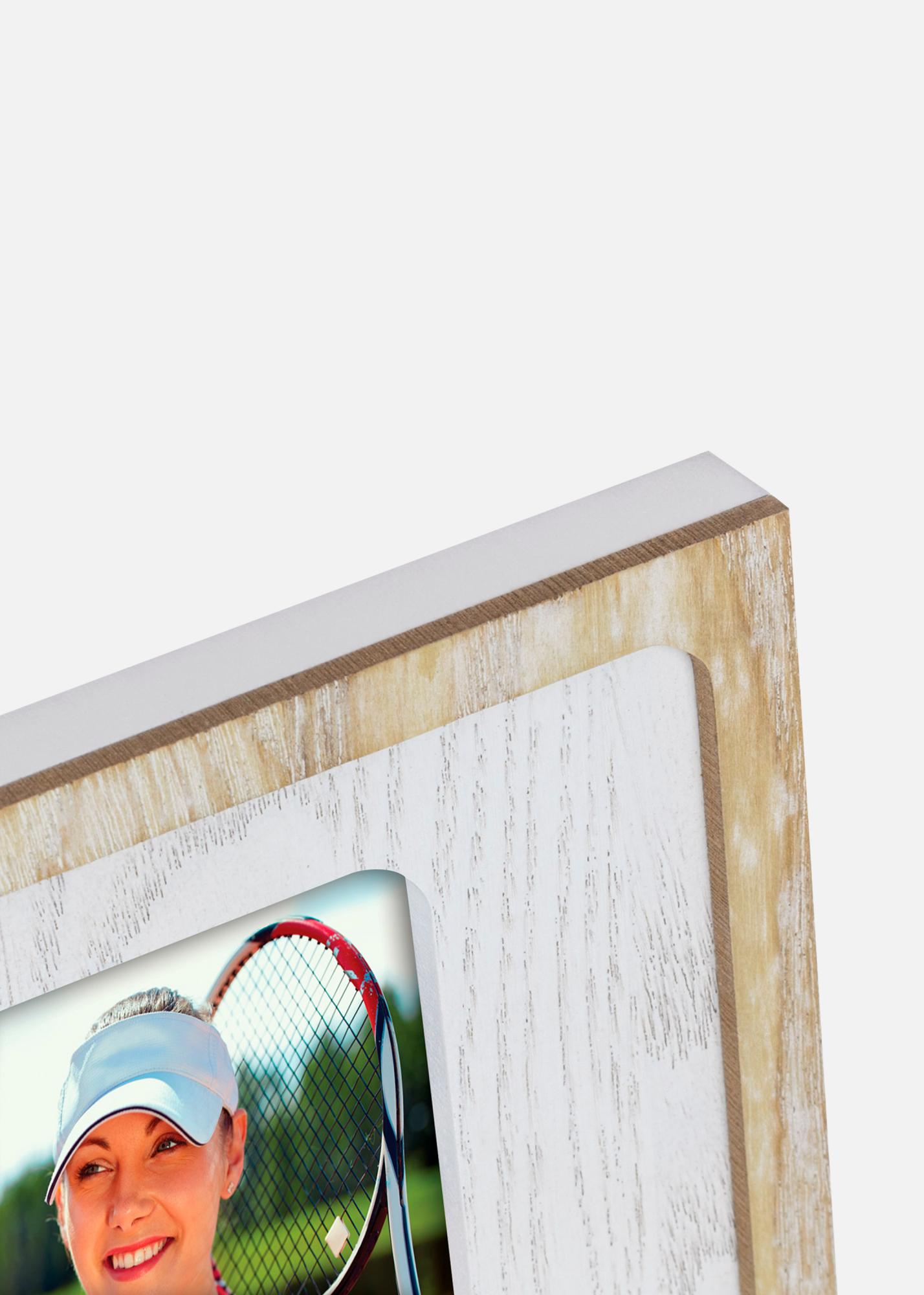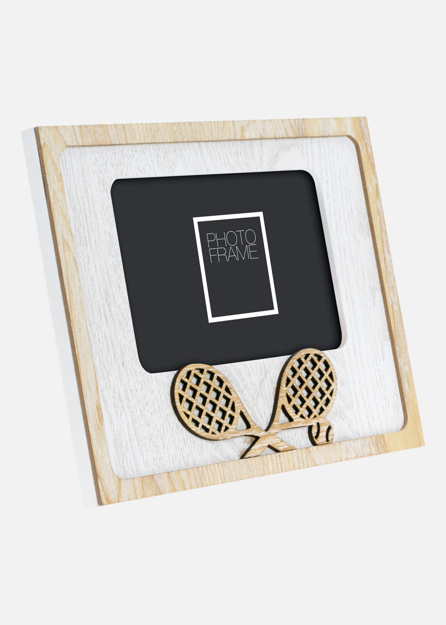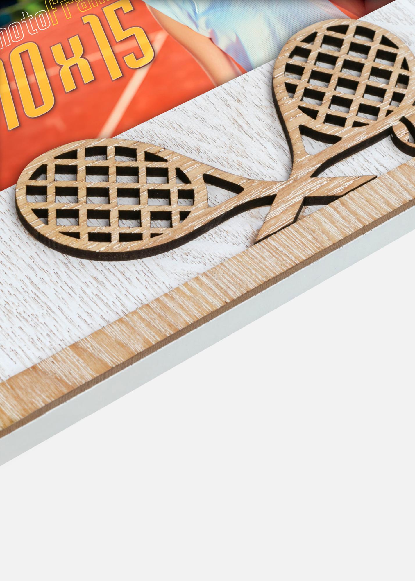 Ein sportlich inspiriertes Fotorahmen mit Tennisthema. Dekoriert mit ausgeschnittenen Tennisschlägern, perfekt zum Einrahmen von Erinnerungen vom Tennisplatz oder Sportaktivitäten. Passend für Bildgröße 10x15 cm.