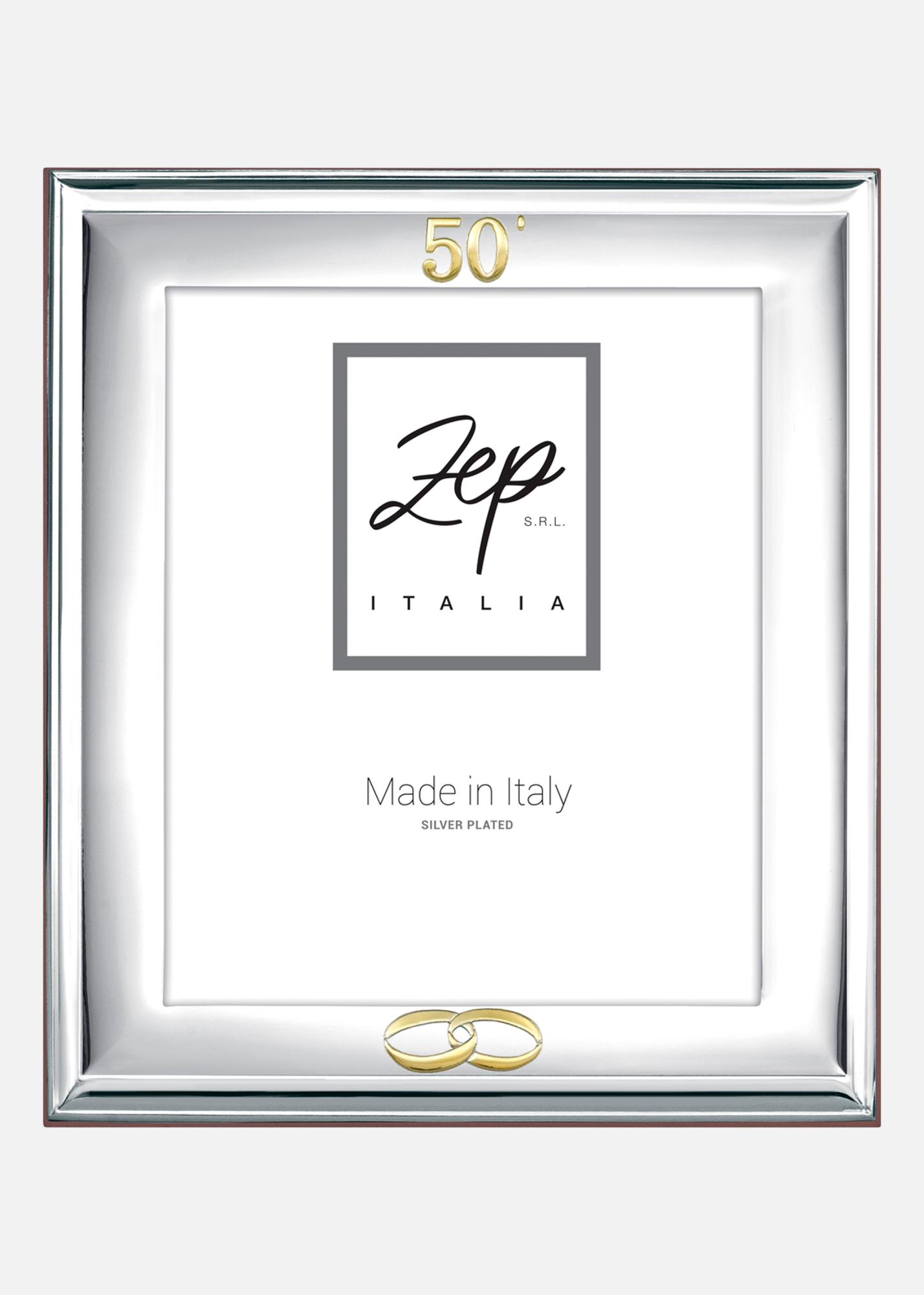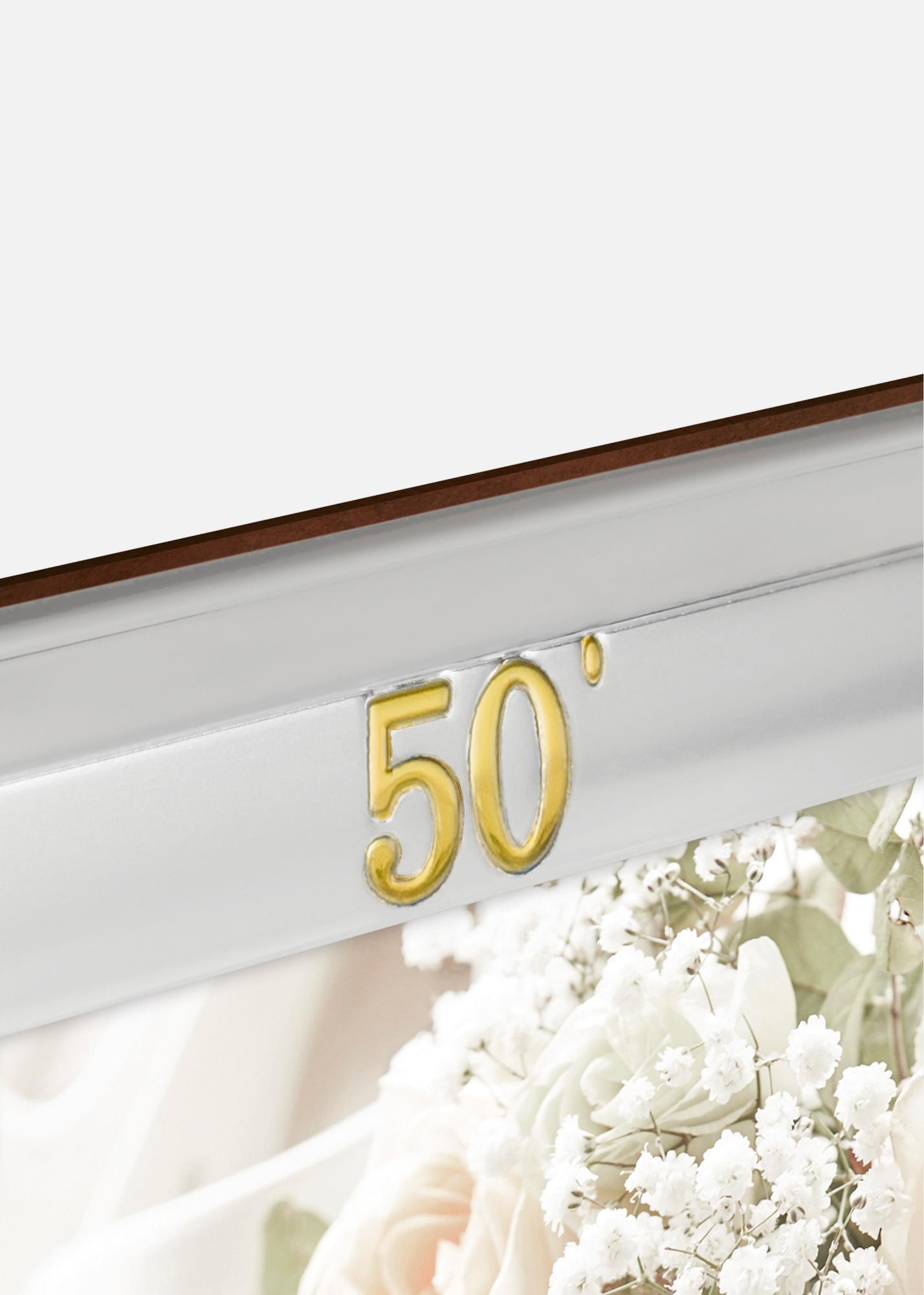 Feiern Sie ein halbes Jahrhundert voller Liebe mit einem eleganten silberfarbenen Metallrahmen, der Ihre schönsten Erinnerungen hervorhebt. Dieser 15x20 cm große Bilderrahmen ist mit symbolischen Details verziert, die Ihre 50-jährige Ehe repräsentieren, einschließlich der klassischen Zahlen "50" und zwei bezaubernden goldenen Eheringen auf der Rahmenleiste.