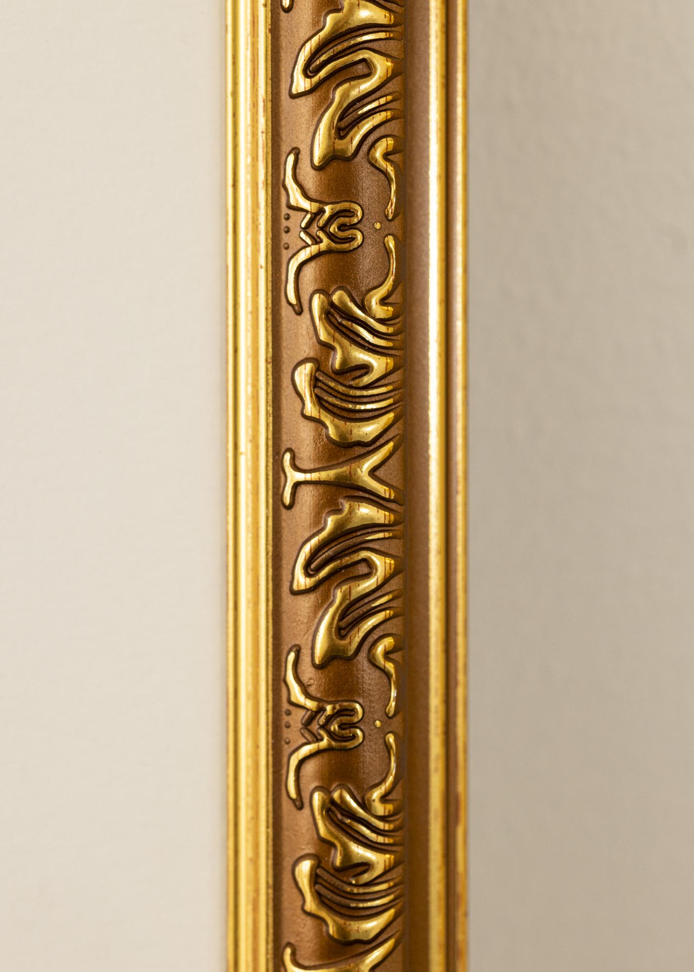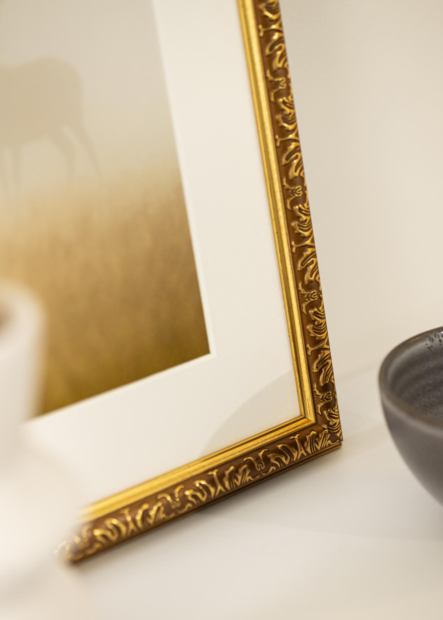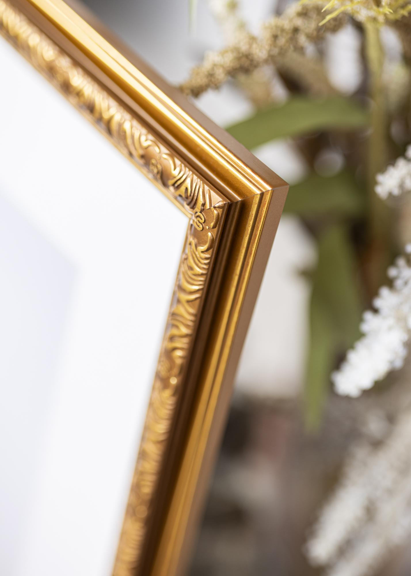 Dieser Fotorahmen in der Größe 20x30 cm ist eine perfekte Kombination aus klassischem Design und moderner Funktionalität. Mit seinem luxuriösen Goldfinish und dekorativen, verzierten Details verleiht er Ihrem Kunstwerk oder Ihren Fotografien einen Hauch von Raffinesse. Die detaillierten Muster entlang der inneren Kante des Rahmens erzeugen ein traditionelles und zeitloses Gefühl, was ihn ideal für sowohl klassische als auch elegante Einrichtungsstile macht.