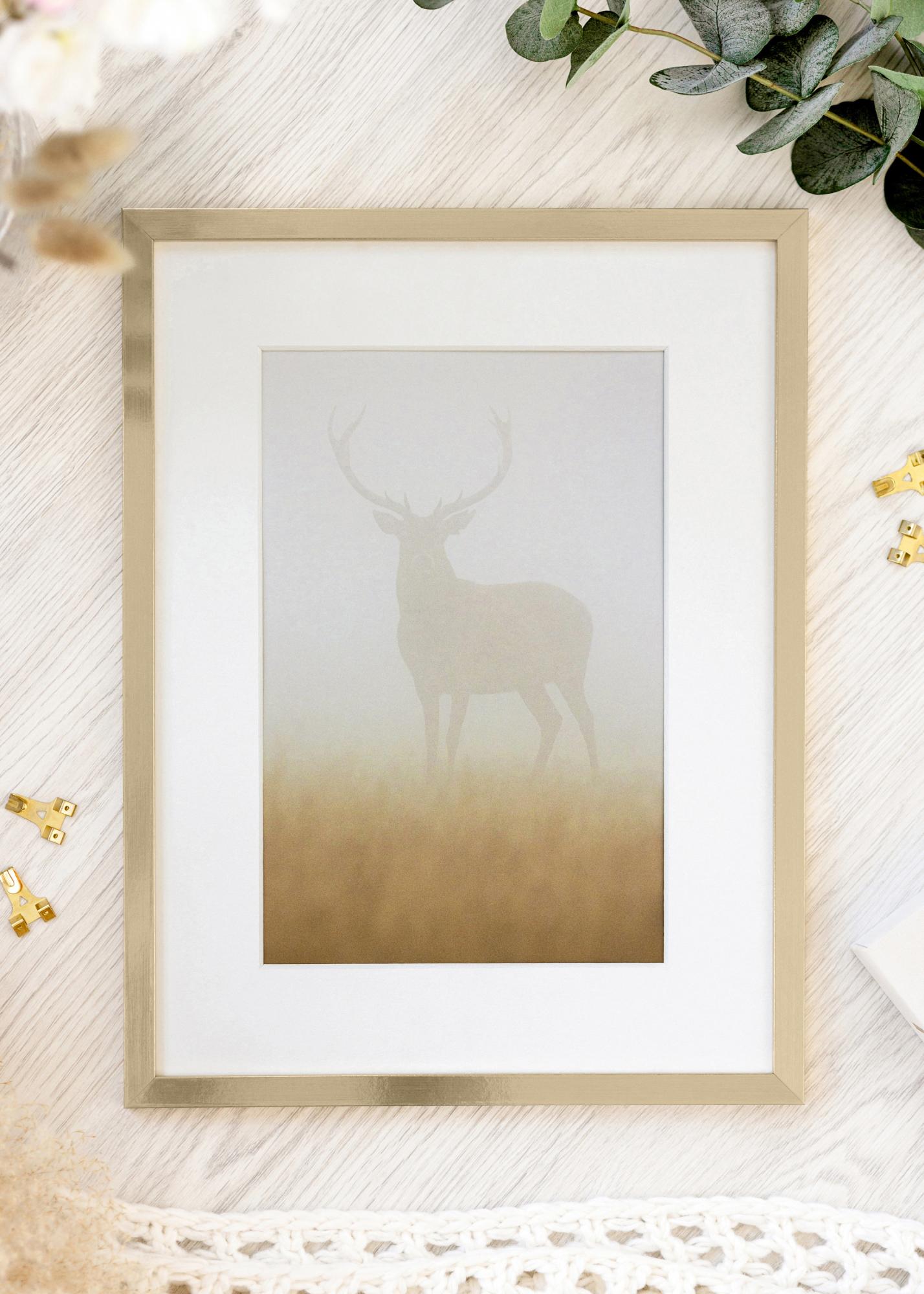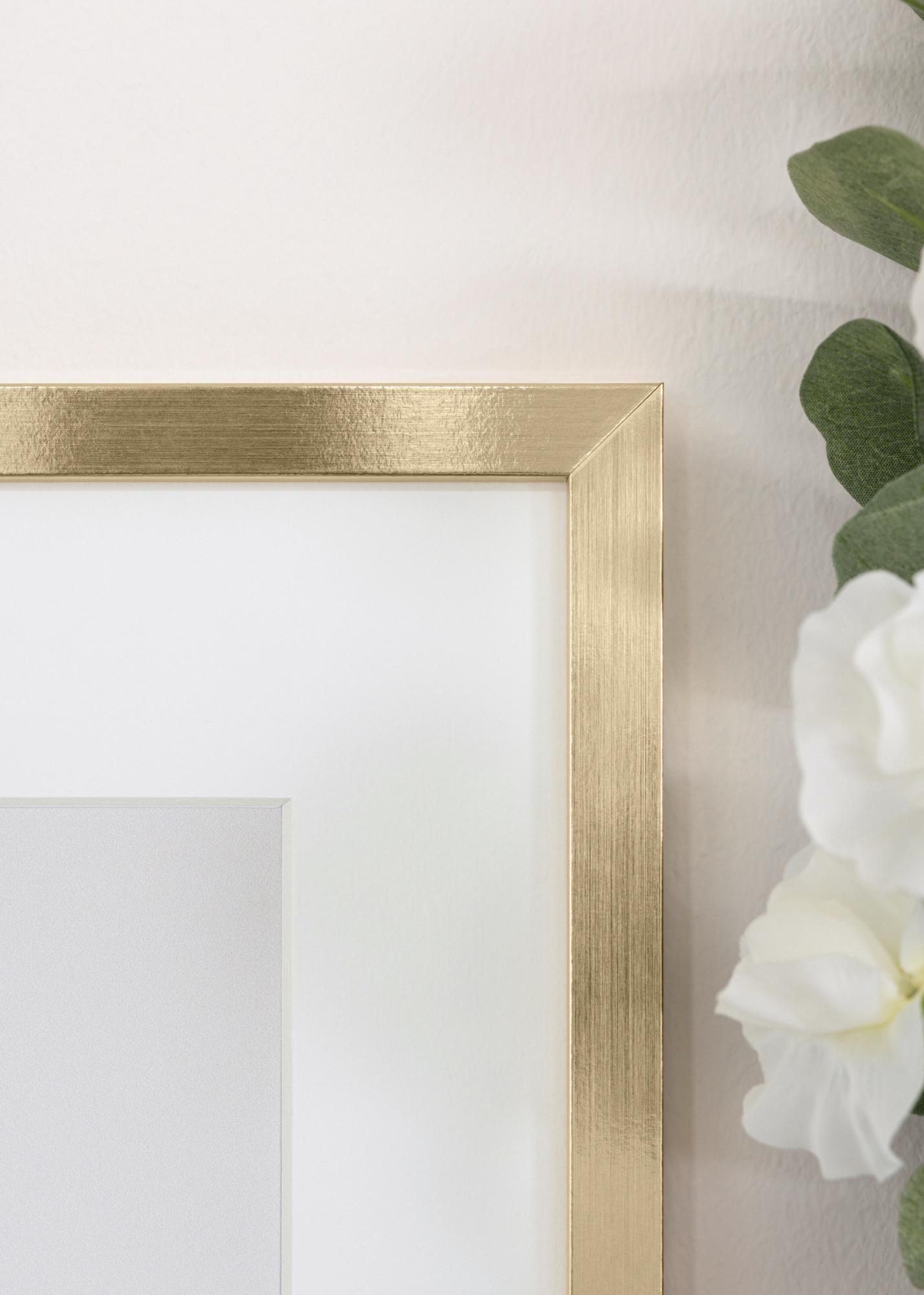 Erstellen Sie eine elegante Bildergalerie mit unserem stilvollen, goldenen Rahmen, perfekt um Ihre Lieblingskunstwerke oder Fotos hervorzuheben. Dieser Bilderrahmen in der Größe 21x29,7 cm (A4) ist ein raffiniertes Detail, das jedem Raum einen Hauch von Luxus verleiht. Mit seiner glänzenden, goldenen Oberfläche und glatten Textur wird er zum sofortigen Blickfang an Ihrer Wand.