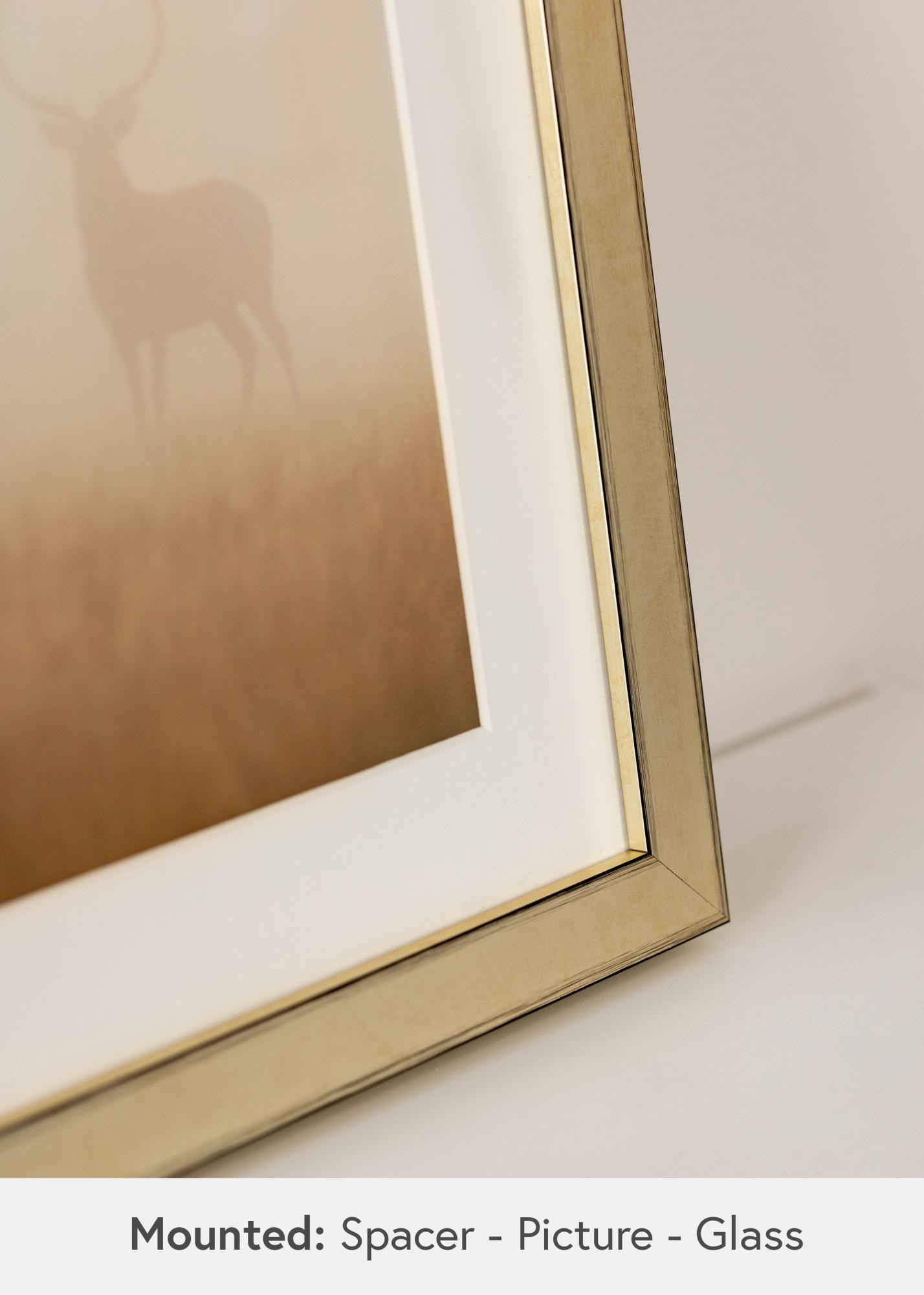 Mit dem Rahmen Tyr Gold haben Sie die Möglichkeit, zu bestimmen, wie Sie Ihr Motiv präsentieren möchten. Sie können es im hinteren Teil des Rahmens platzieren, um einen schwebenden Eindruck zu erzeugen, oder näher an der Vorderseite für eine traditionellere Einrahmung. Diese Flexibilität erleichtert es, den Rahmen sowohl mit Ihrem Kunstwerk als auch mit Ihrem Einrichtungsstil abzustimmen.