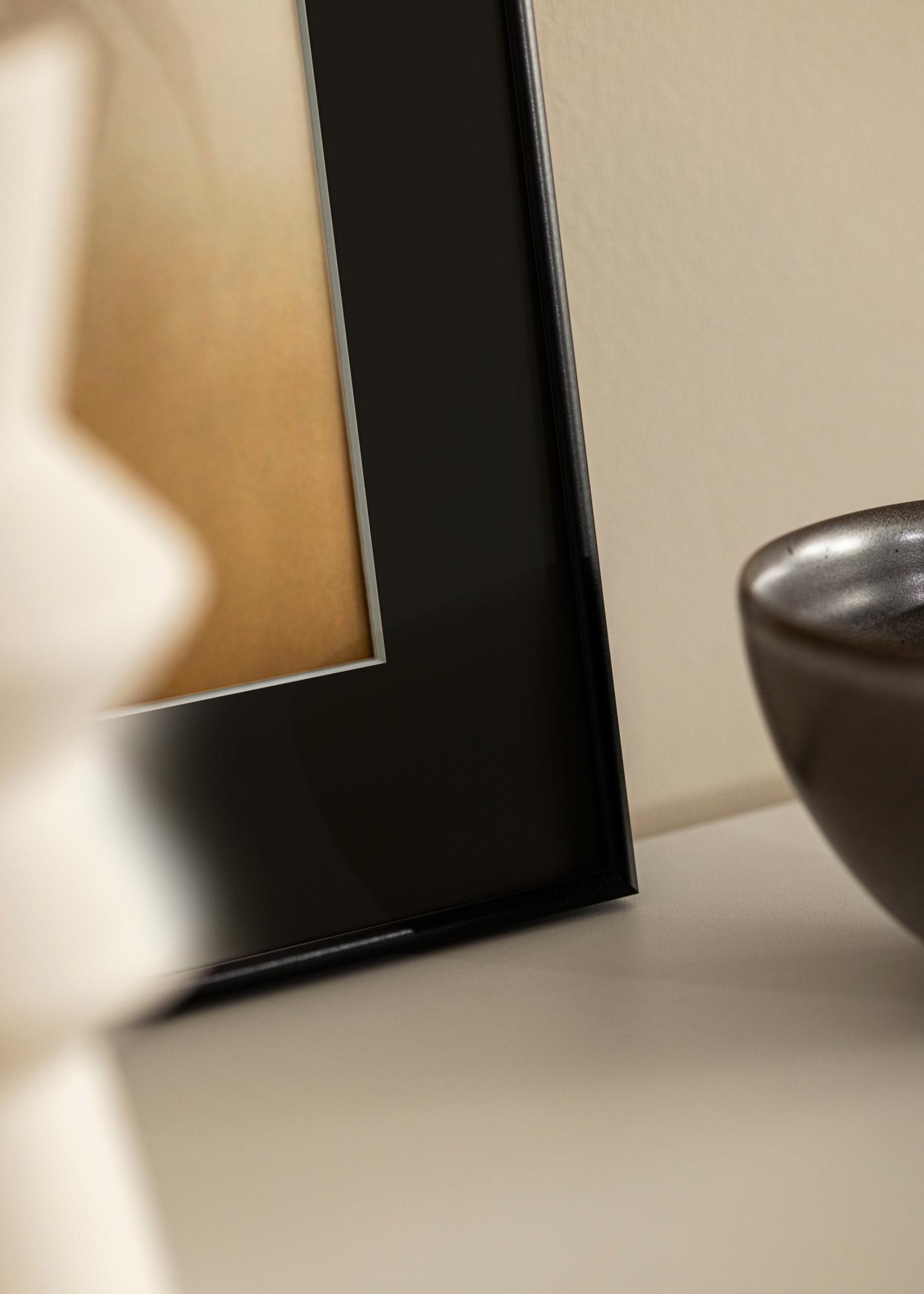 Set mit Bilderrahmen und passendem, schwarzem Passepartout. Das Produktbild zeigt die Maße des Rahmens (fettgedruckt) und die Innenmaße des Passepartouts (in Klammern). Bitte beachten, dass die Innenmaße des Passepartouts immer 1 cm kleiner sein müssen als die gewünschte Bildgröße.