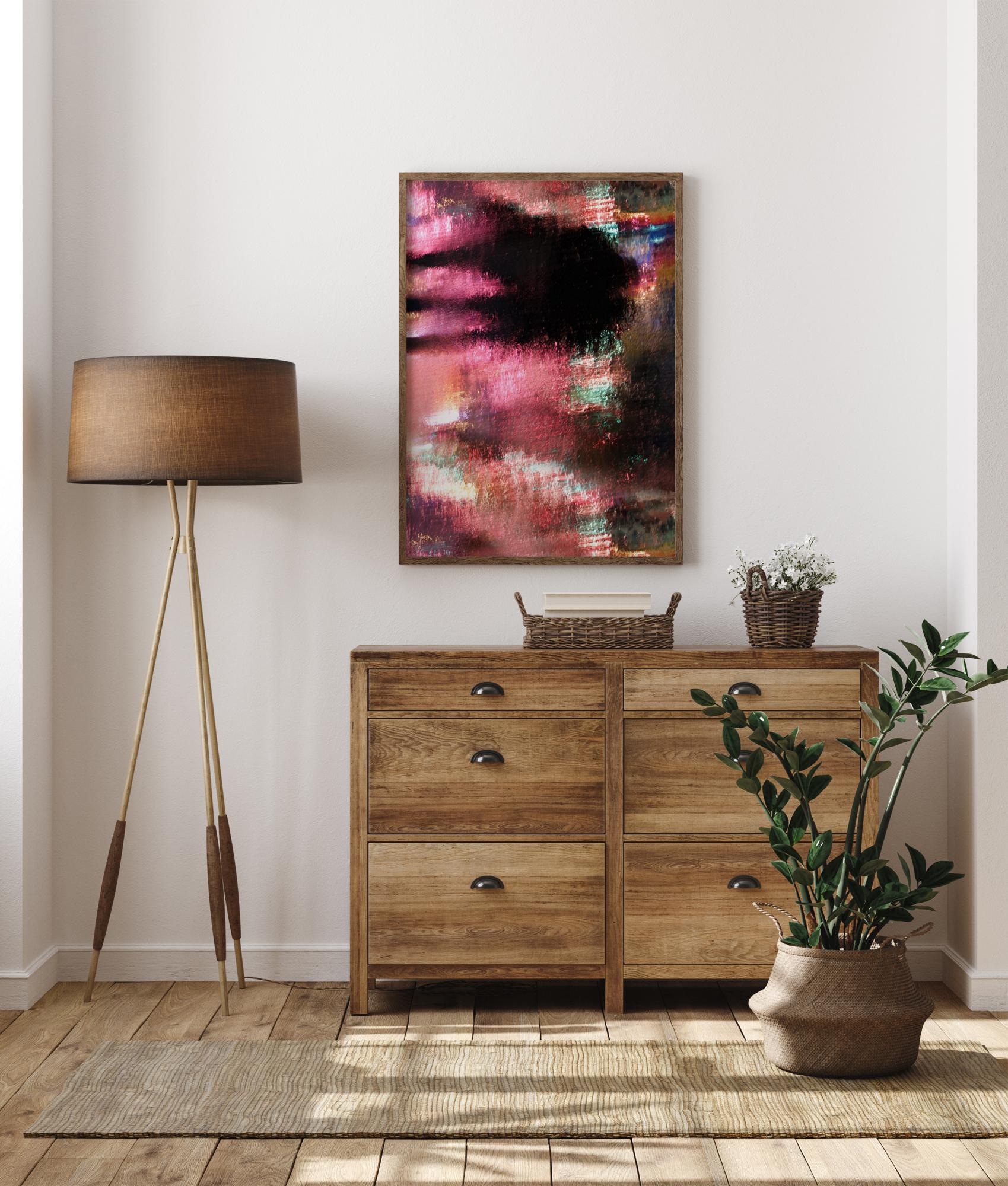 Eine perfekte Farbmischung mit rosa Tönen dominiert diesen mehrfarbigen Druck. Oben auf dem Poster befindet sich eine schwarze Fläche, die ein Gefühl von Tiefe vermittelt. Rechts von der schwarzen Fläche befindet sich eine vertikale Röhrenform in Rot- und Grüntönen. Ein perfekter Druck, um einer schlichten Wand einen Hauch von Farbe zu verleihen.
