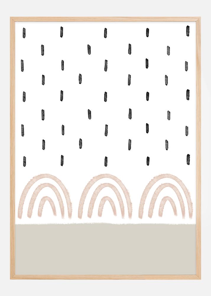 Dieses künstlerische Poster, "Rain on Rainbows", kombiniert Verspieltheit und Minimalismus auf einzigartige Weise. Das Motiv zeigt einen Hintergrund mit regenbogenfarbenen Aquarellen in sanften Terrakotta-Tönen auf einer sauberen weißen Basis. Über diesen weichen Bögen schwebt eine Ansammlung abstrakter Pinselstriche, die Regen ähneln, in einer ungeordneten Symmetrie. Die Farben der Regenbögen kontrastieren wunderbar mit den tuschschwarzen "Regentropfen", was ein dynamisches, aber dennoch harmonisches Bild schafft.
