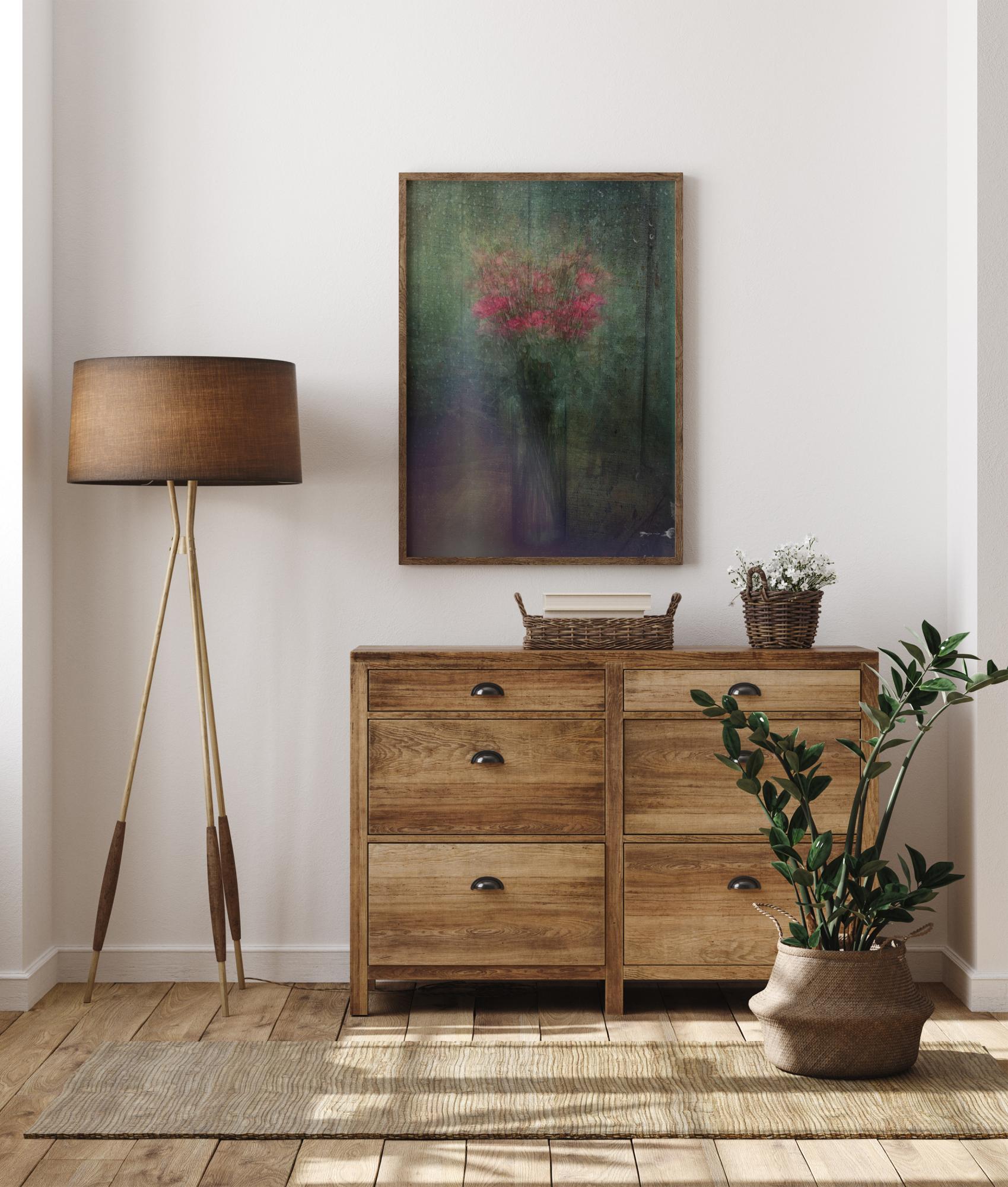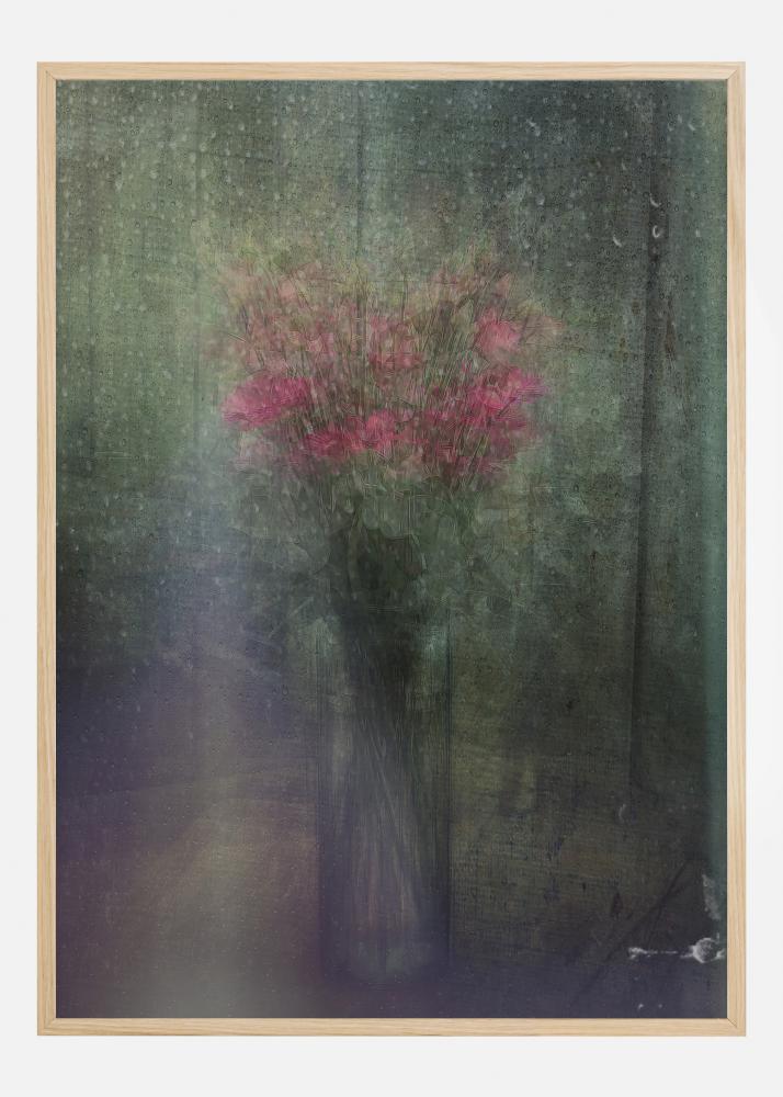 Ein erstaunliches Poster eines rosa Blumenstraußes an einem regnerischen Tag. Die transparente Blumenvase steht vor einem grünen Hintergrund auf einer hellen, malvenfarbenen Oberfläche. Das natürliche Licht strahlt auf die Blumenstängel. Ein idealer Druck für eine Wohnzimmerwand.