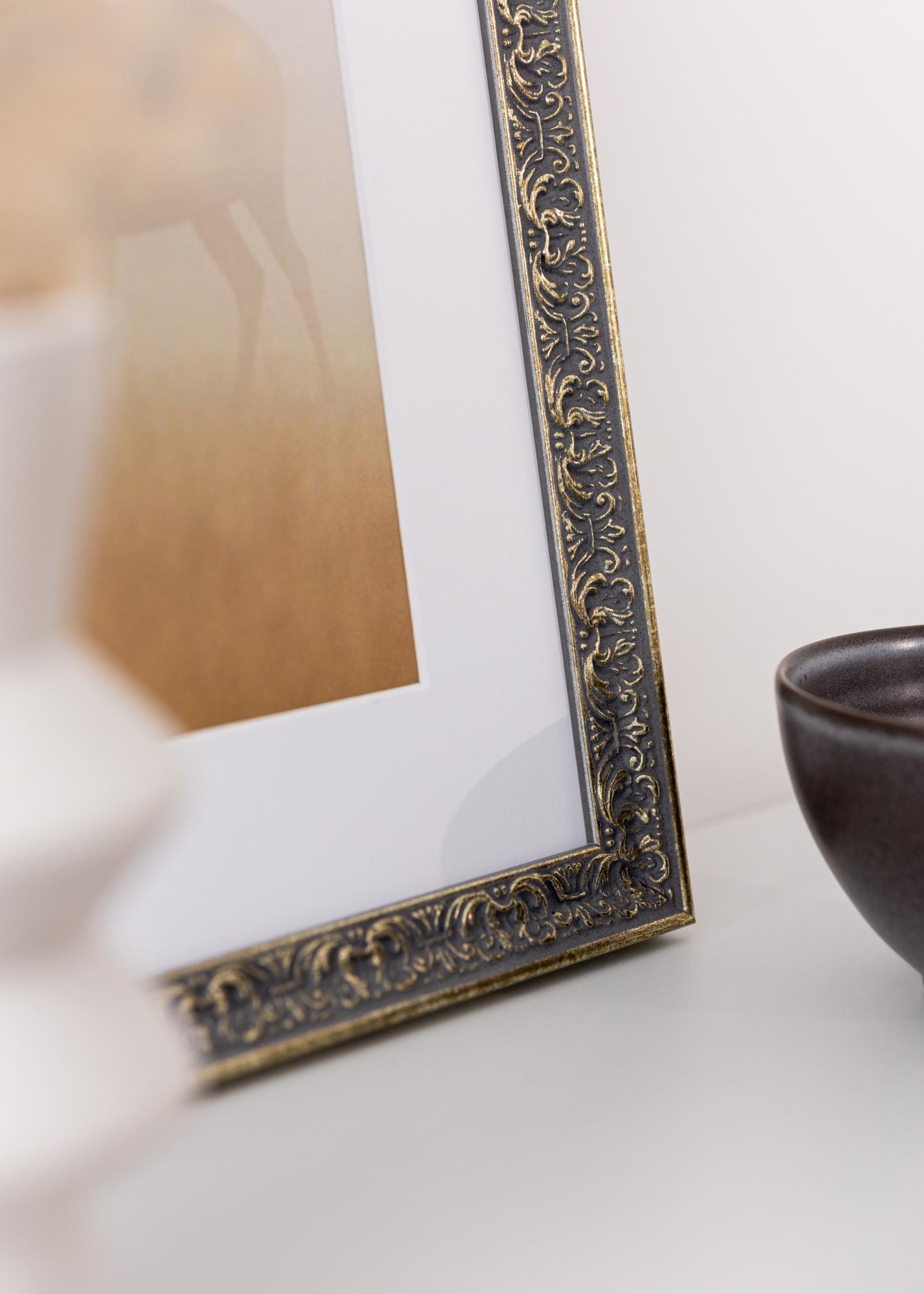 Dieser elegante Fotorahmen ist eine perfekte Kombination aus klassischem Design und moderner Funktionalität. Mit seinem antikinspirierten Stil und wunderschön detaillierten Verzierungen in einem grauen Farbton mit goldenen Akzenten verleiht er jedem Raum ein Vintage-Gefühl. Der Rahmen ist aus Holz gefertigt und hat eine 25 mm breite Leiste sowie eine Tiefe von 24 mm, was ihm ein robustes und solides Gefühl verleiht.