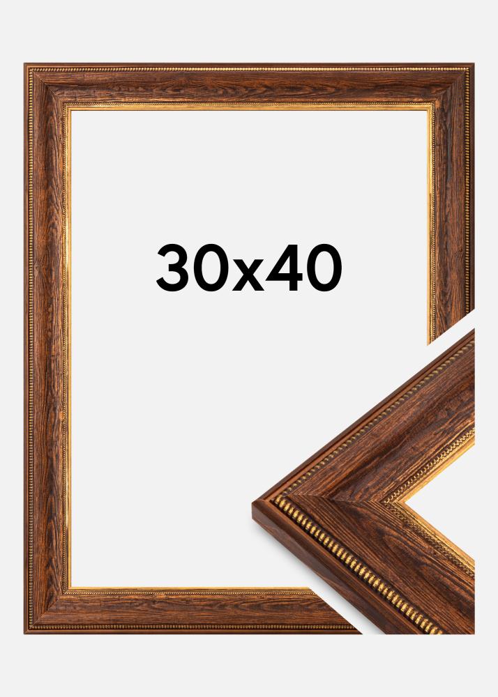Dieser elegante Bilderrahmen in der Größe 30x40 cm ist eine perfekte Kombination aus rustikalem Charme und klassischer Eleganz. Hergestellt aus hochwertigem Holz, hat der Rahmen eine tiefe und warme braune Farbe, die die natürliche Struktur des Holzes betont. Die dekorativen Golddetails entlang der inneren Kante verleihen eine raffinierte Note und machen diesen Rahmen ideal für traditionelle und vintage-inspirierte Inneneinrichtungen.