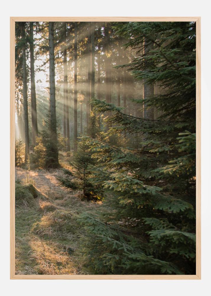 Ein reizvolles Porträt im Wald. Der Sonnenuntergang scheint durch das Laub und der Waldboden ist von kleineren Bäumen umgeben. Diese malerische Landschaft schafft eine gemäßigte Atmosphäre mit einer entspannenden und kühlen Umgebung. Perfekt für ein grünes Wohnzimmer.