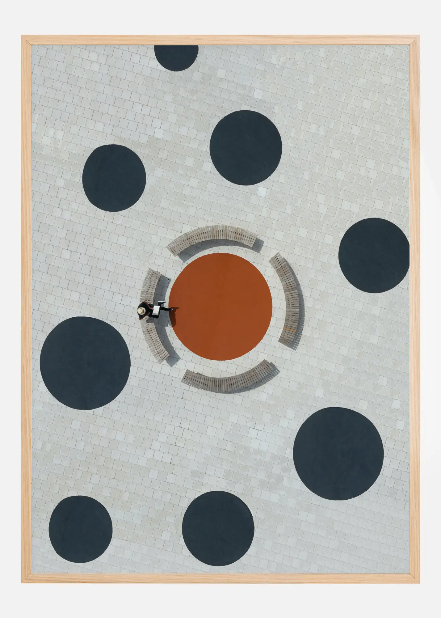 Dieses konzeptionelle Poster fängt eine unverwechselbare Vogelperspektive einer lesenden Person ein, umgeben von einer symmetrischen und grafischen Komposition. Das abstrakte Design der weißen Kacheloberfläche, durchsetzt mit großen schwarzen Kreisen und einem zentralen rostroten Kreis mit Bänken, bietet einen starken visuellen Kontrast. Dieses Poster ist nicht nur eine Hommage an Design und Architektur, sondern auch eine spielerische Interpretation alltäglicher Szenen.